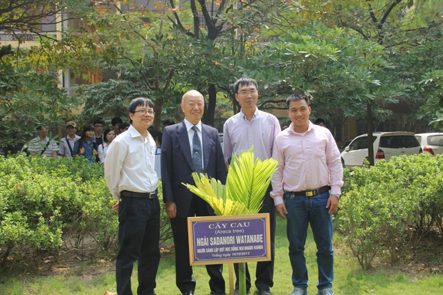 GS.Watanabe chụp ảnh kỷ niệm cùng thầy cô và các bạn sinh viên bên cây cau lưu niệm giáo sư đã trồng nhân dịp kỷ niệm 8 năm thành lập và hợp tác của Quỹ học bổng Watanabe-Kanda và Trường ĐHKHTN (tháng 10/2013).
