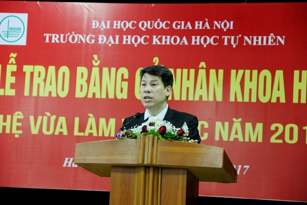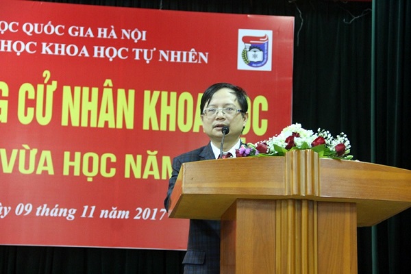 Đại diện lãnh đạo Trường ĐHKHTN, PGS.TSKH. Vũ Hoàng Linh - Phó Bí thư Đảng ủy, Phó Hiệu trưởng chúc mừng toàn thể tân Cử nhân khoa học ngành Công nghệ Sinh học hệ VHVL năm 2017. Phó Hiệu trưởng cho rằng bằng Cử nhân khoa học là thành quả của chặng đường dài với những khó khăn trong công việc, cuộc sống, là niềm vui không chỉ của các tân cử nhân, gia đình mà còn của Nhà trường và thầy cô giáo Khoa Sinh đã trực tiếp giảng dạy. PGS.TSKH. Vũ Hoàng Linh đánh giá cao sự quan tâm, tận tình của Khoa dành cho tập thể và các cá nhân sinh viên. Phó Hiệu trưởng mong muốn kiến thức học được sẽ giúp ích cho công việc hiện tại của các cử nhân và giữ mối liên hệ bền chặt với các em sau khi ra trường.
