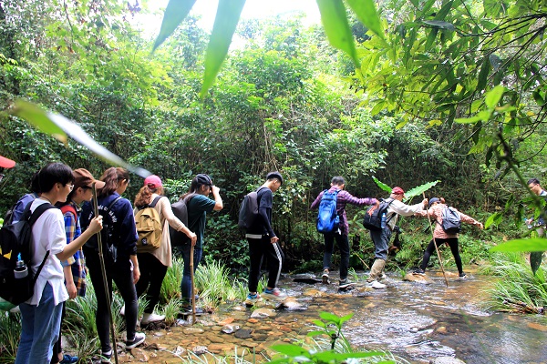 Sinh viên làm bài tập thực hành trên rừng dưới sự hướng dẫn của thầy cô Khoa Sinh học
