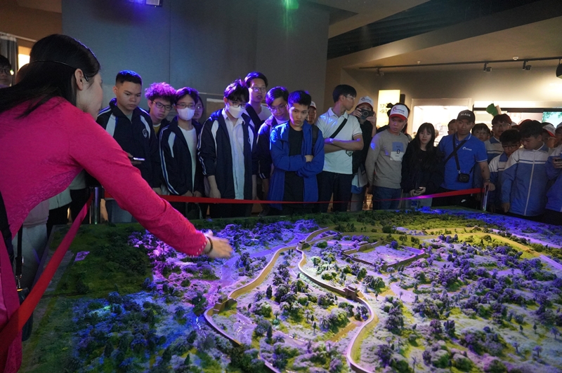 Các bạn sinh viên chăm chú lắng nghe và tìm hiểu lịch sử dân tộc qua các hiện vật và sa bàn