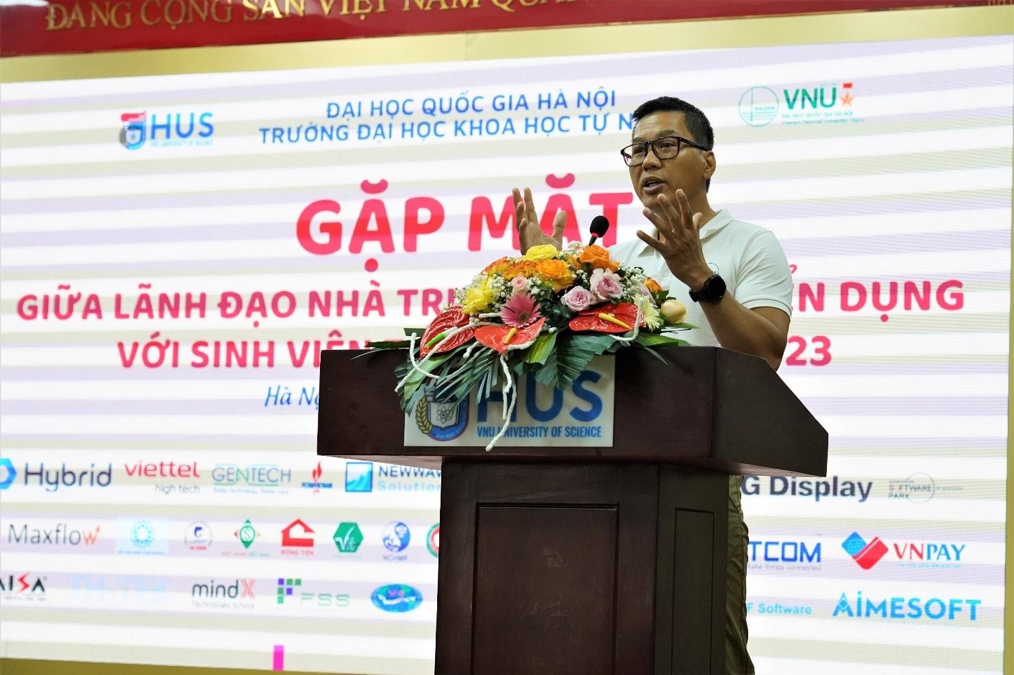 Phát biểu tại buổi gặp mặt, GS.TS. Lê Thanh Sơn, Phó Hiệu trưởng Trường ĐHKHTN đã gửi lời cảm ơn các nhà tuyển dụng đã ủng hộ công tác đào tạo của Nhà trường, đồng thời chúc mừng các em sinh viên đã vượt qua chặng đường học tập gian nan để nhận tấm bằng cử nhân, bước đầu đến với một chặng đường mới.