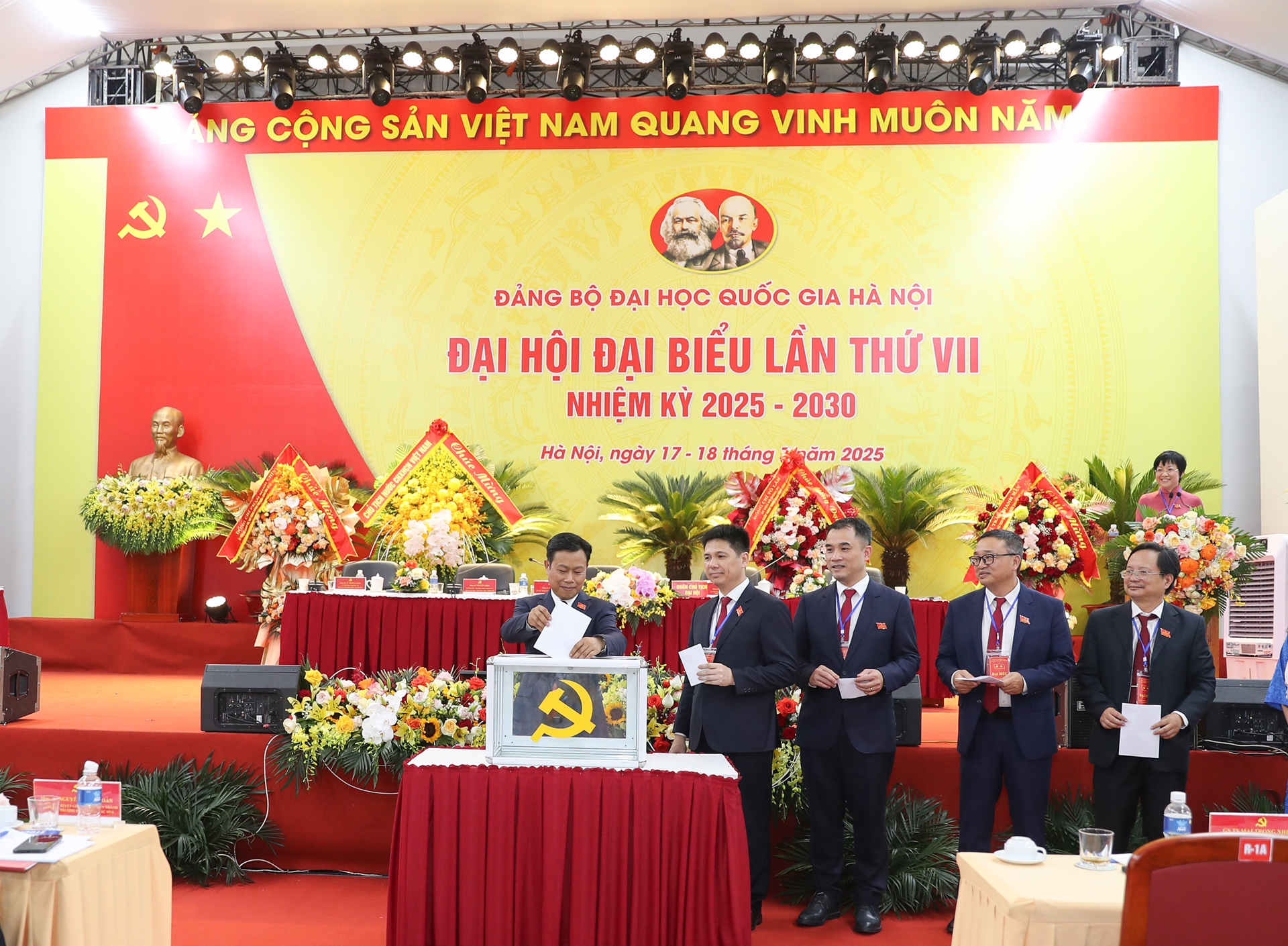 Các đại biểu bỏ phiếu bầu Ban Chấp hành Đảng bộ ĐHQGHN khóa VII, nhiệm kỳ 2025-2030 và bầu Đoàn đại biểu đi dự Đại hội đại biểu lần thứ XVIII Đảng bộ Thành phố Hà Nội