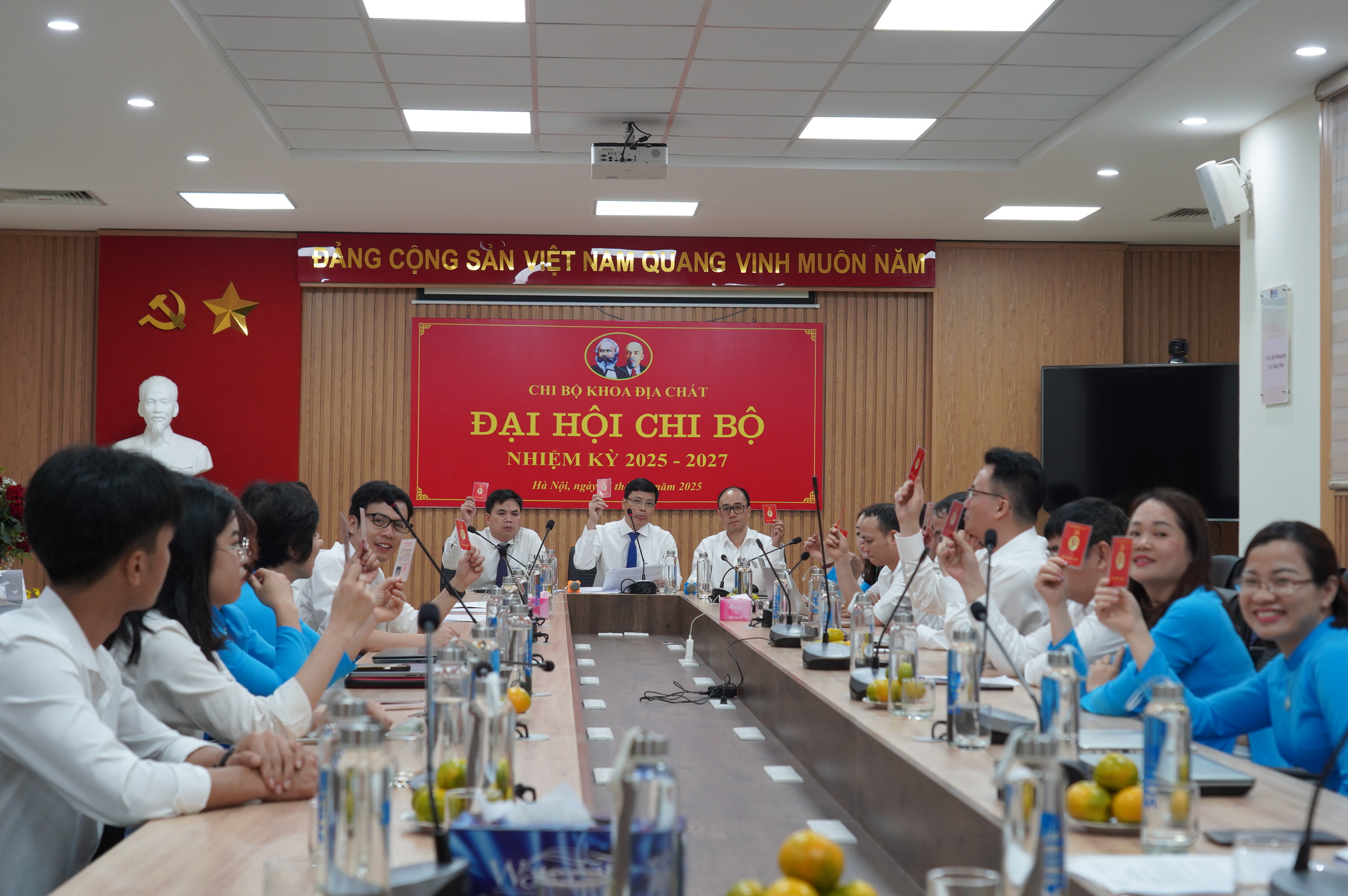 Đảng viên chi bộ Khoa Địa chất tiến hành biểu quyết trong đại hội.