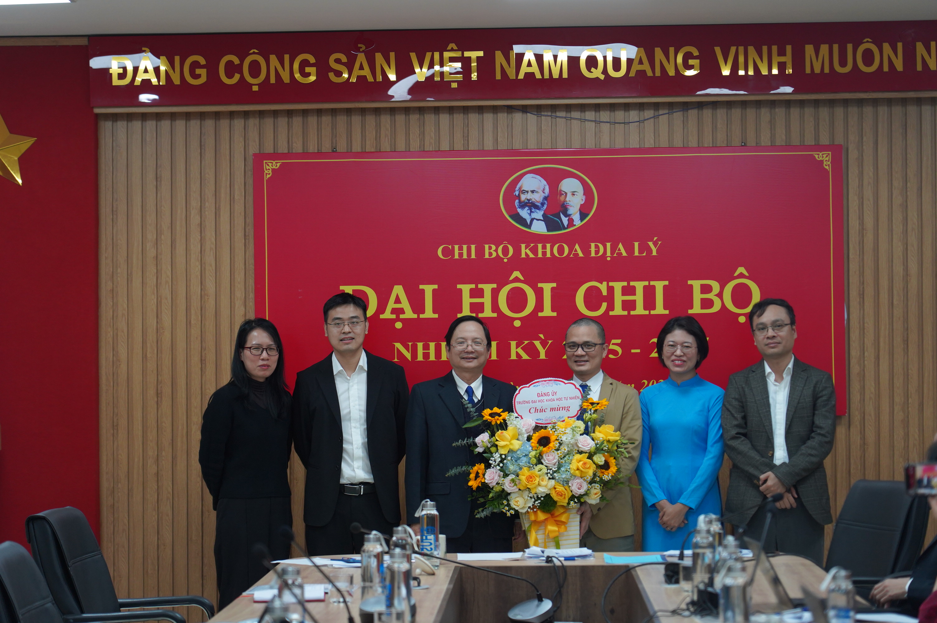 GS.TSKH. Vũ Hoàng Linh, Bí thư Đảng uỷ Trường ĐHKHTN tặng hoa chúc mừng Ban chấp hành chi bộ khoa Địa lý nhiệm kỳ 2025-2027.