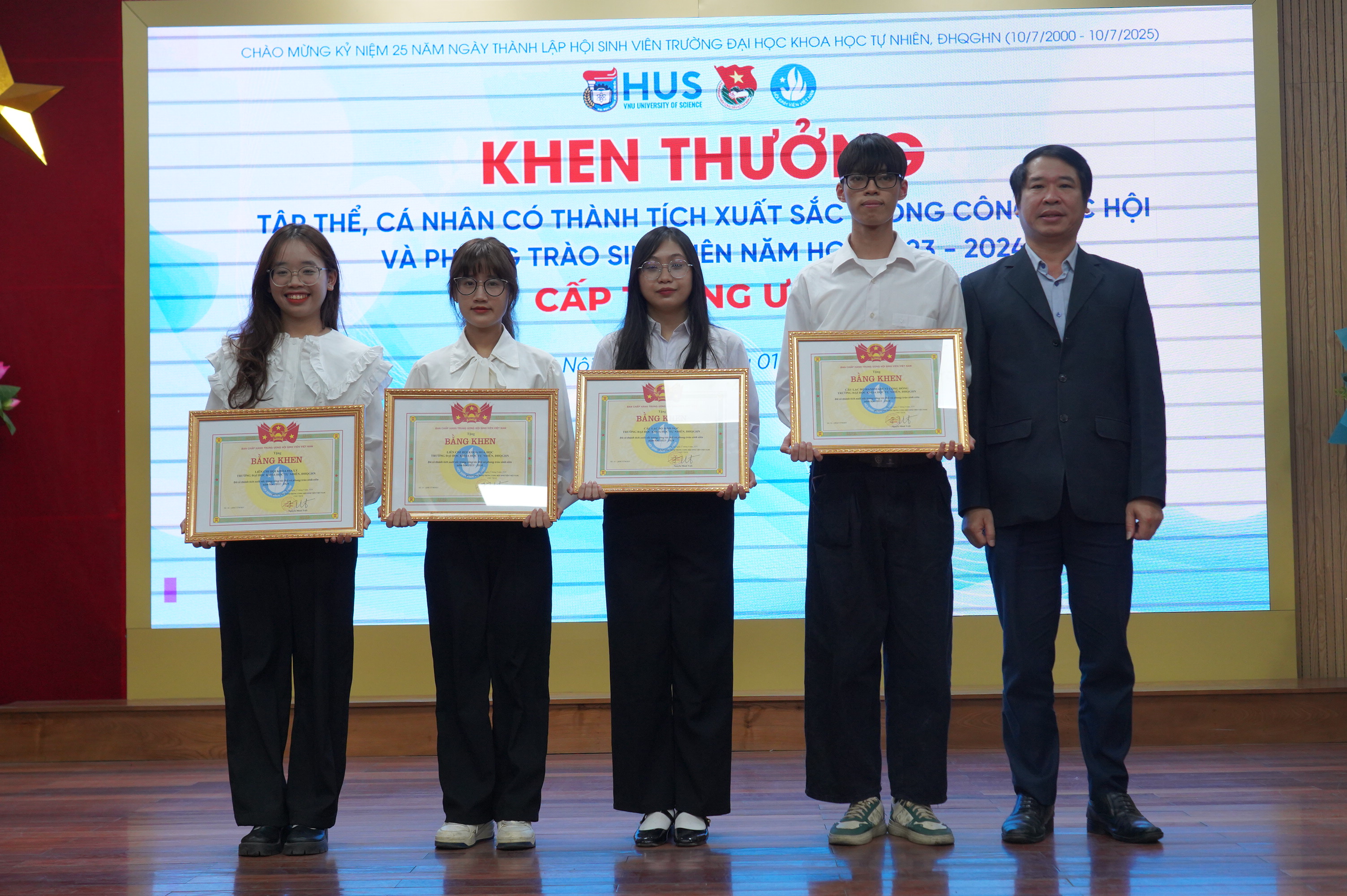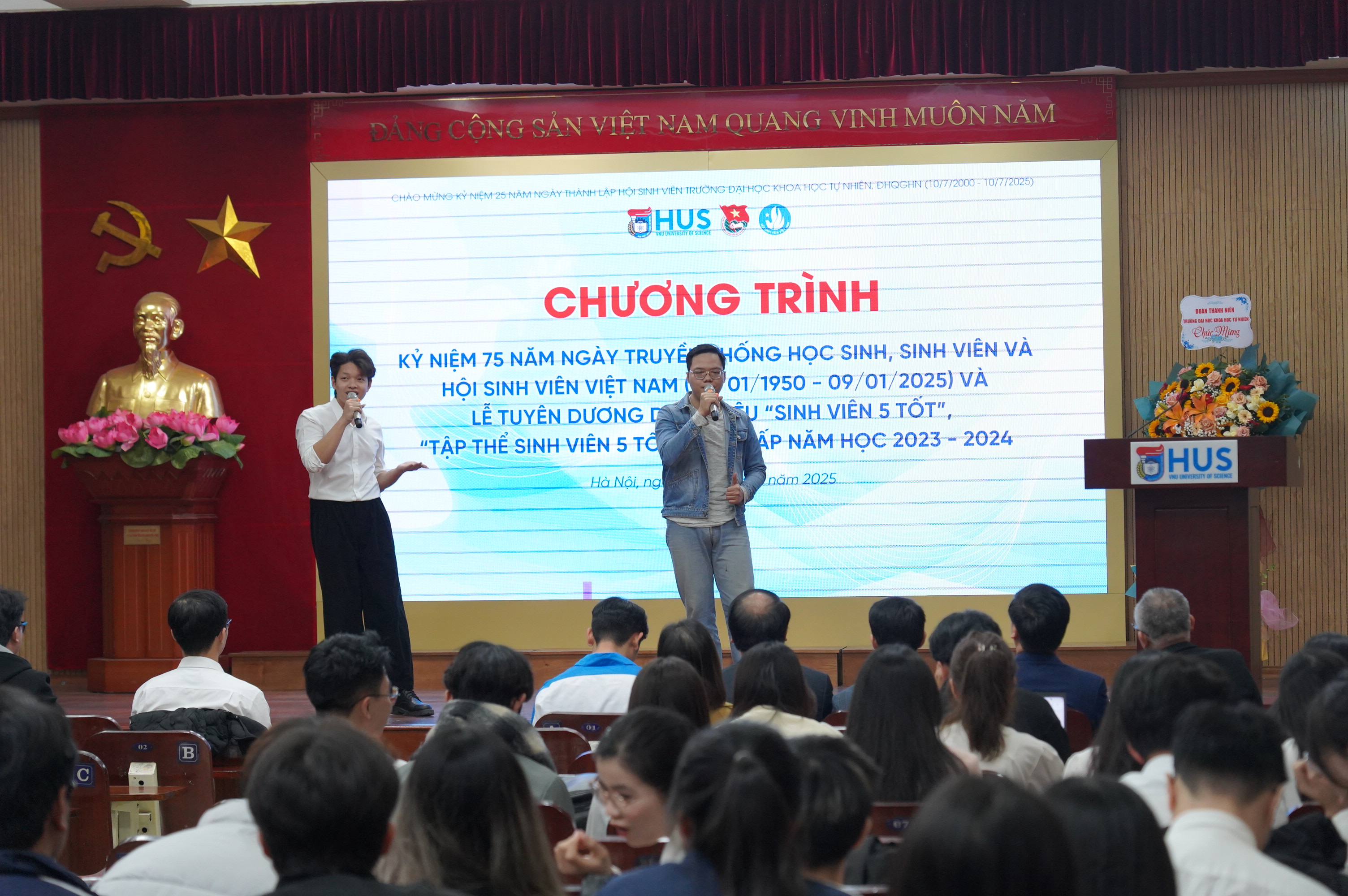 Ngày 08/01/2025, trong không khí kỷ niệm 75 năm Ngày truyền thống học sinh, sinh viên và Hội Sinh viên Việt Nam (09/01/1950 - 9/1/2025) và hướng tới chào mừng kỷ niệm 25 năm Ngày thành lập Hội Sinh viên trường Đại học Khoa học Tự nhiên, Đại học Quốc gia Hà Nội (10/7/2000 - 10/7/2025), Hội Sinh viên Trường Đại học Khoa học Tự nhiên đã trang trọng tổ chức Chương trình kỷ niệm 75 năm Ngày truyền thống học sinh, sinh viên và Hội Sinh viên Việt Nam và Lễ tuyên dương danh hiệu “Sinh viên 5 tốt”, “Tập thể sinh viên 5 tốt” các cấp năm học 2023 – 2024.