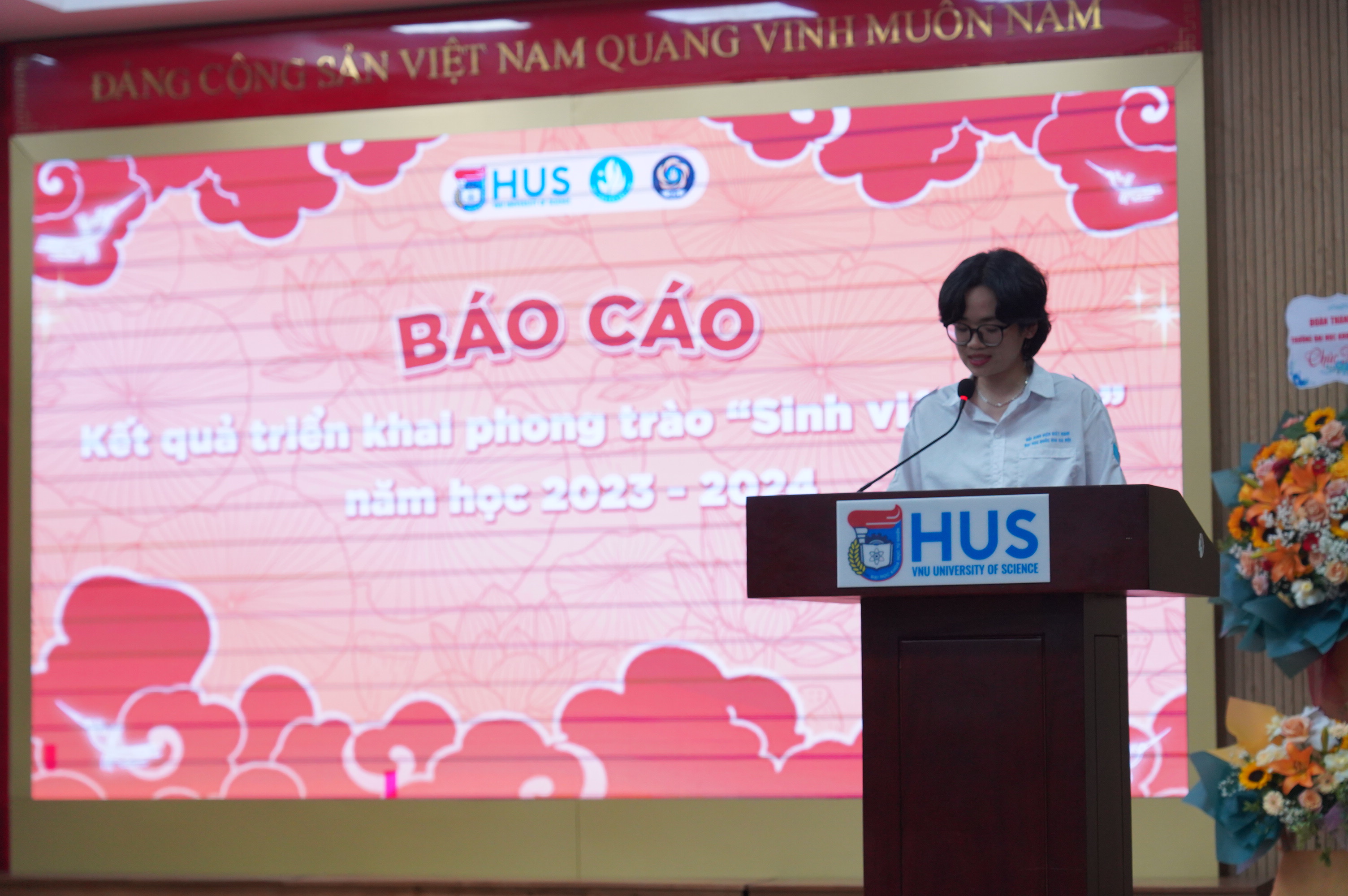Đồng chí Giang Ngọc Thảo, Phó Chủ tịch Hội Sinh viên Trường ĐHKHTN báo cáo kết quả triển khai phong trào “Sinh viên 5 Tốt” năm học 2023 - 2024 và Phương hướng, nhiệm vụ, giải pháp năm học 2024-2025.