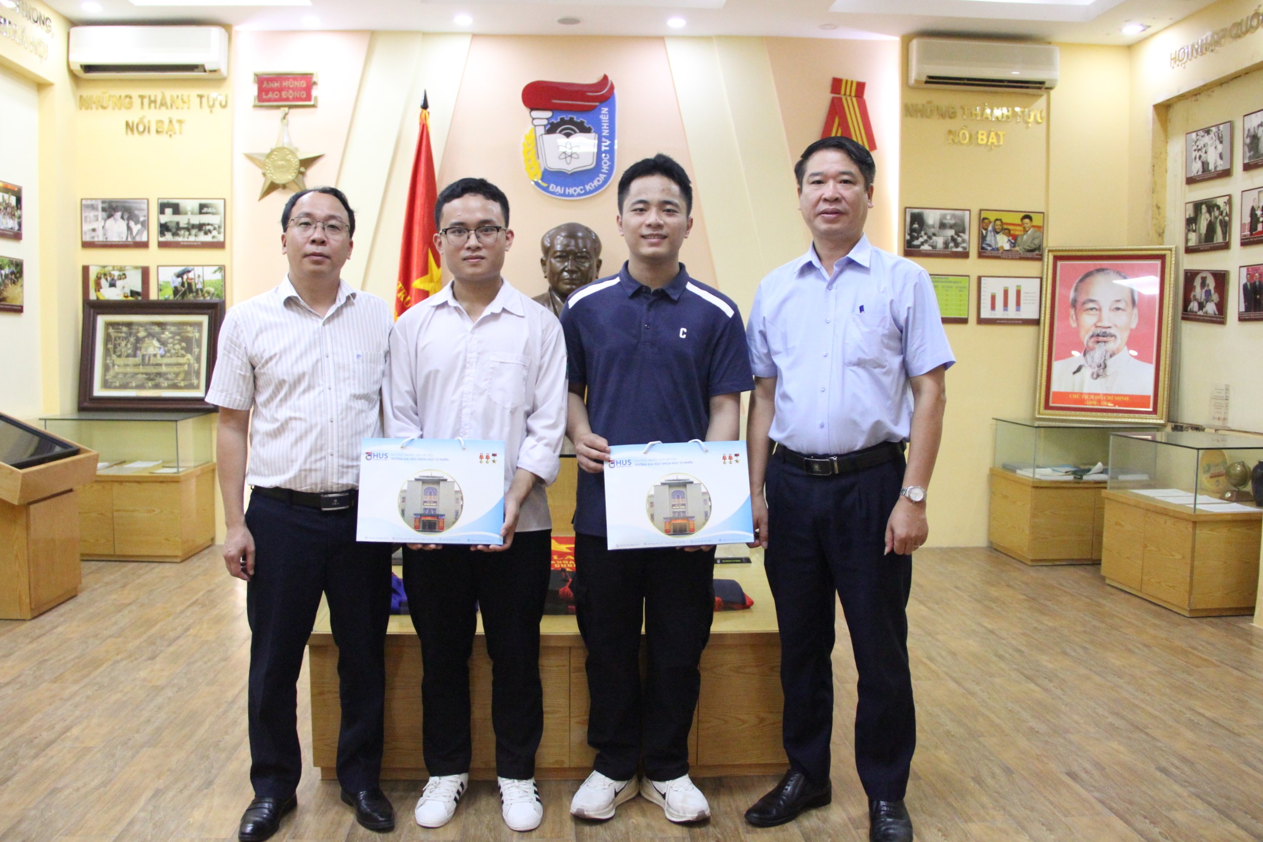 GS.TS. Lê Thanh Sơn, Hiệu trưởng Trường ĐHKHTN và PGS.TS. Trần Mạnh Cường trao quà cho 2 tân sinh viên tài năng: Trần Minh Hoàng và Ngô Quang Minh.