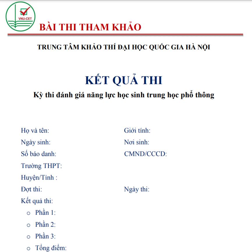 Trung tâm Khảo thí, ĐHQGHN công bố đề tham khảo kỳ thi đánh giá năng lực học sinh THPT năm 2021. Theo đó, đề thi gồm 150 câu hỏi trắc nghiệm, trong đó có 18 câu hỏi dạng điền đáp án, được thực hiện trong vòng 195 phút.
