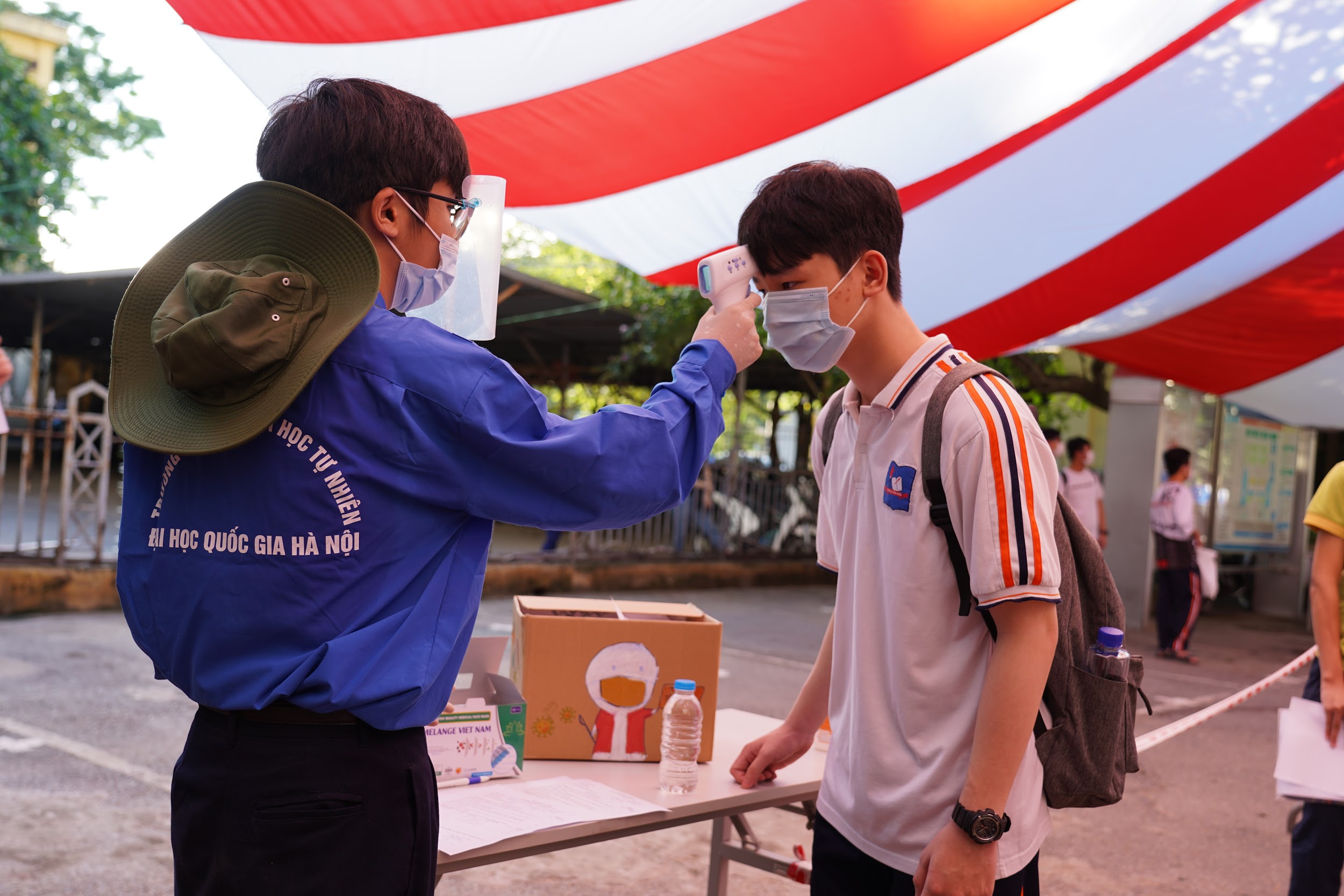 Lực lượng thanh niên tình nguyện được bố trí trực tại các điểm cổng vào khu vực thi để đo thân nhiệt và kiểm tra thông tin tờ khai y tế.