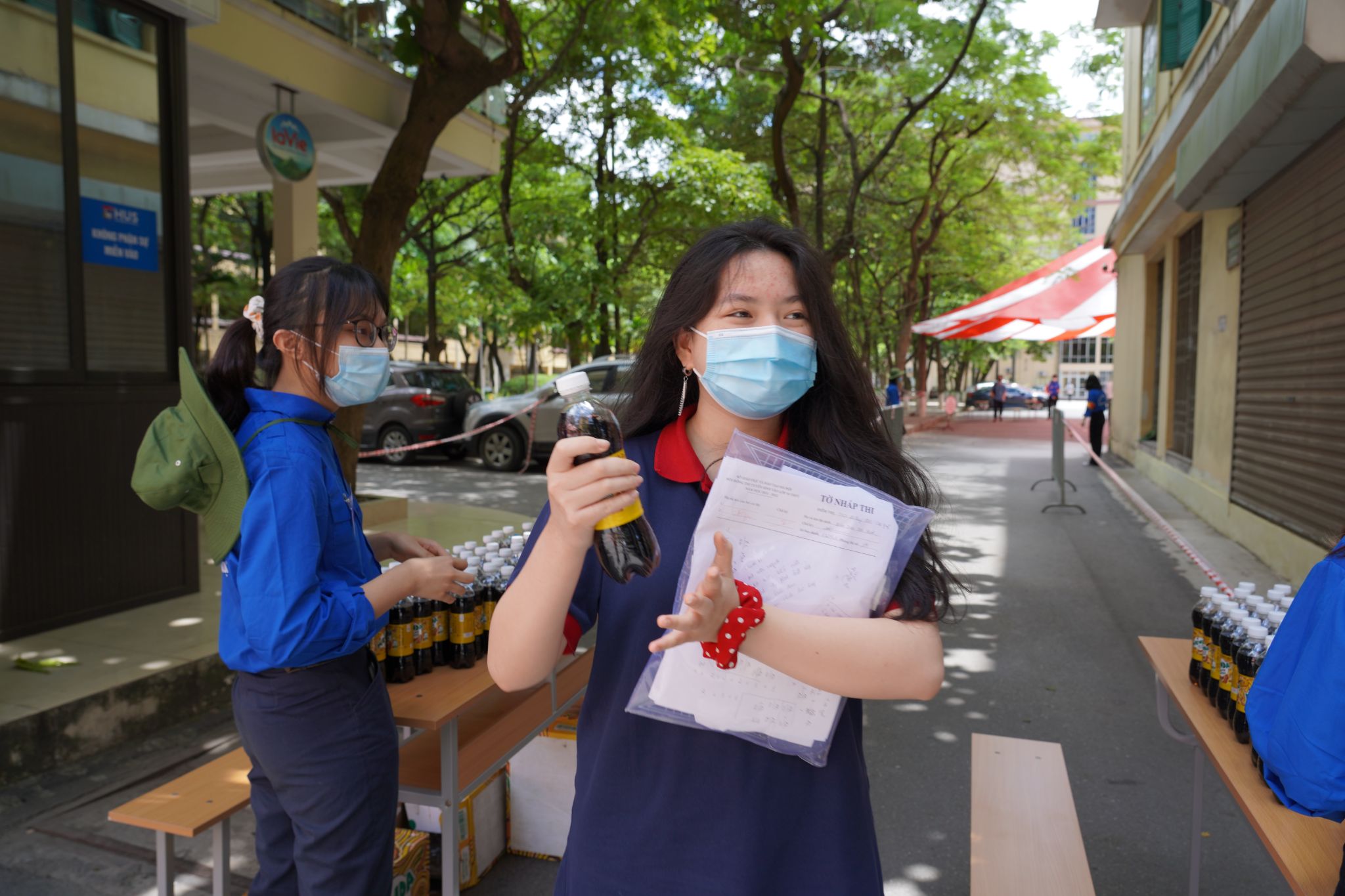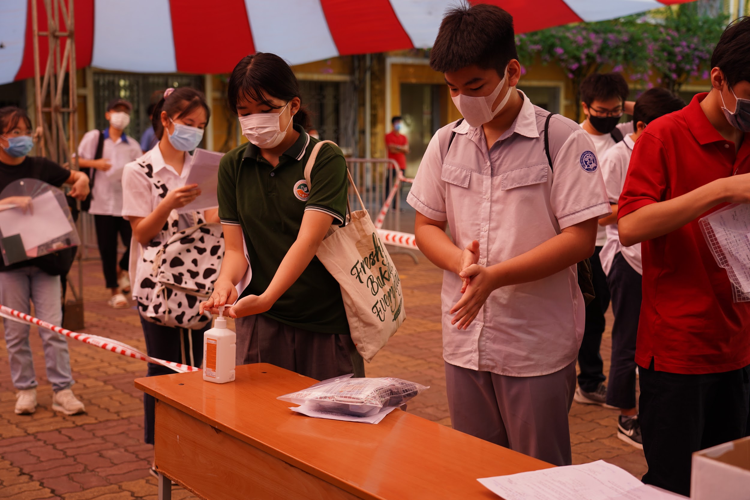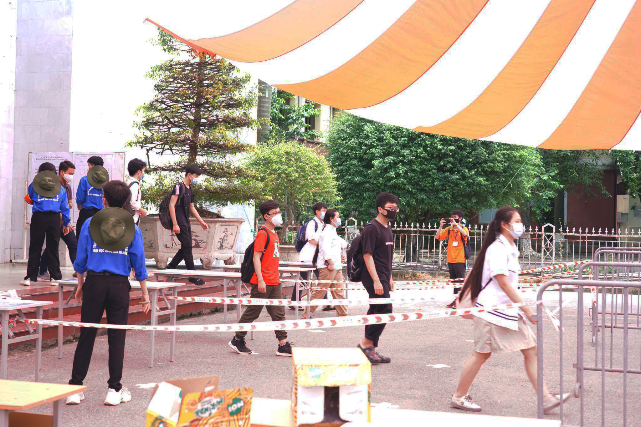 Trước cửa vào mỗi khu vực thi luôn có lực lượng thanh niên tình nguyện “chốt chặn” làm nhiệm vụ đo thân nhiệt, hỗ trợ thí sinh điền thông tin vào tờ khai y tế cũng như hướng dẫn thí sinh vào phòng thi. Các bạn thí sinh được yêu cầu rửa tay sát khuẩn, đứng giãn cách đúng quy định trong suốt quá trình làm thủ tục vào khu vực thi.
