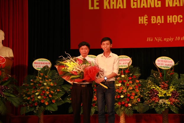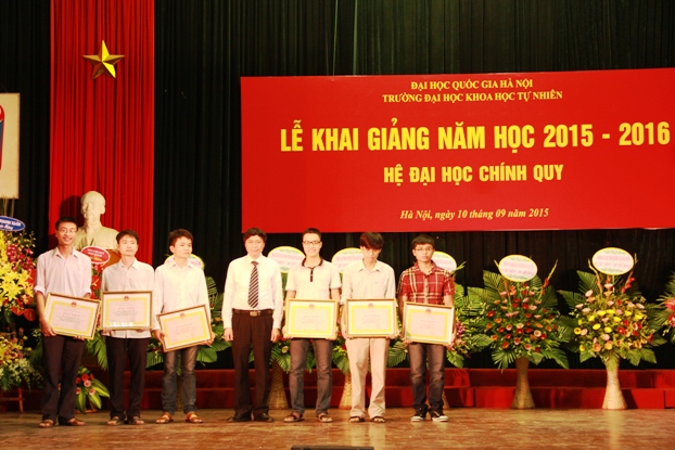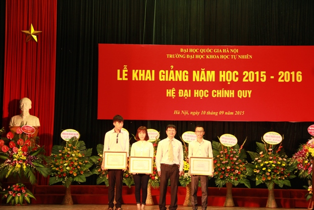 Nguyễn Thế Hoàn – Tân sinh viên lớp Cử nhân Khoa học tài năng ngành Toán học (Huy chương Vàng Olympic Toán học quốc tế 2 năm liên tiếp 2014, 2015) đại diện cho các tân sinh viên phát biểu cảm tưởng và tặng hoa tri ân các thầy cô nhân ngày khai trường. “Là học sinh THPT chuyên Khoa học Tự nhiên, với những thành tích đạt được trong kỳ thi Olympic Toán học quốc tế, em được tuyển thẳng vào nhiều trường đại học, nhưng em quyết định chọn Trường ĐHKHTN để tiếp tục niềm đam mê học tập và nghiên cứu khoa học của mình”.
