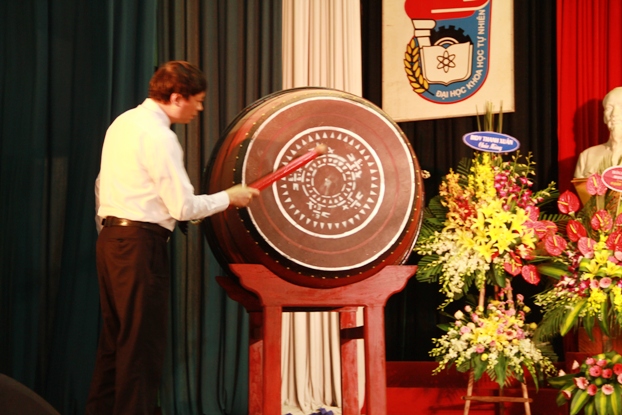PGS. TS Nguyễn Văn Nội đánh trống khai giảng năm học mới 2015 - 2016.