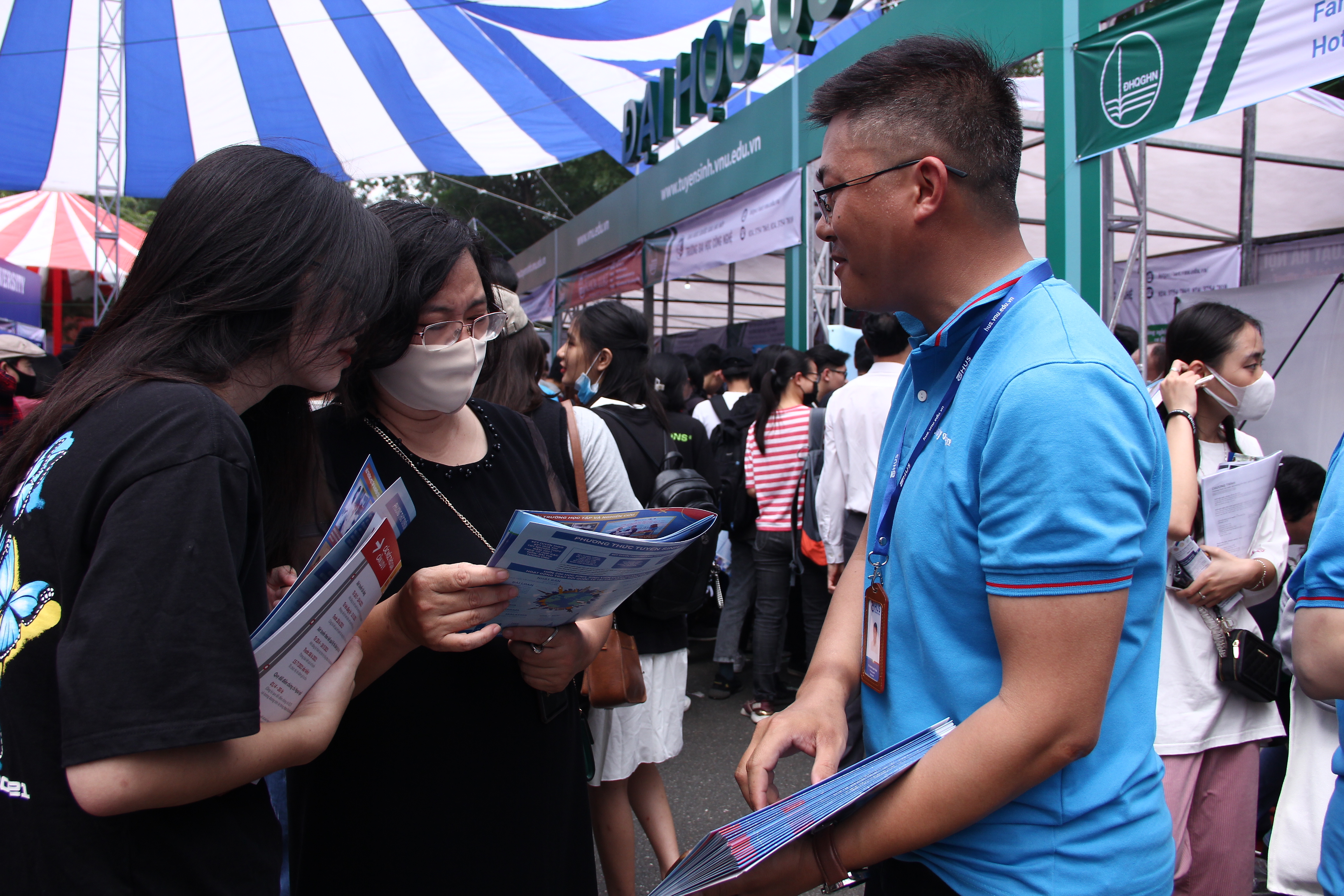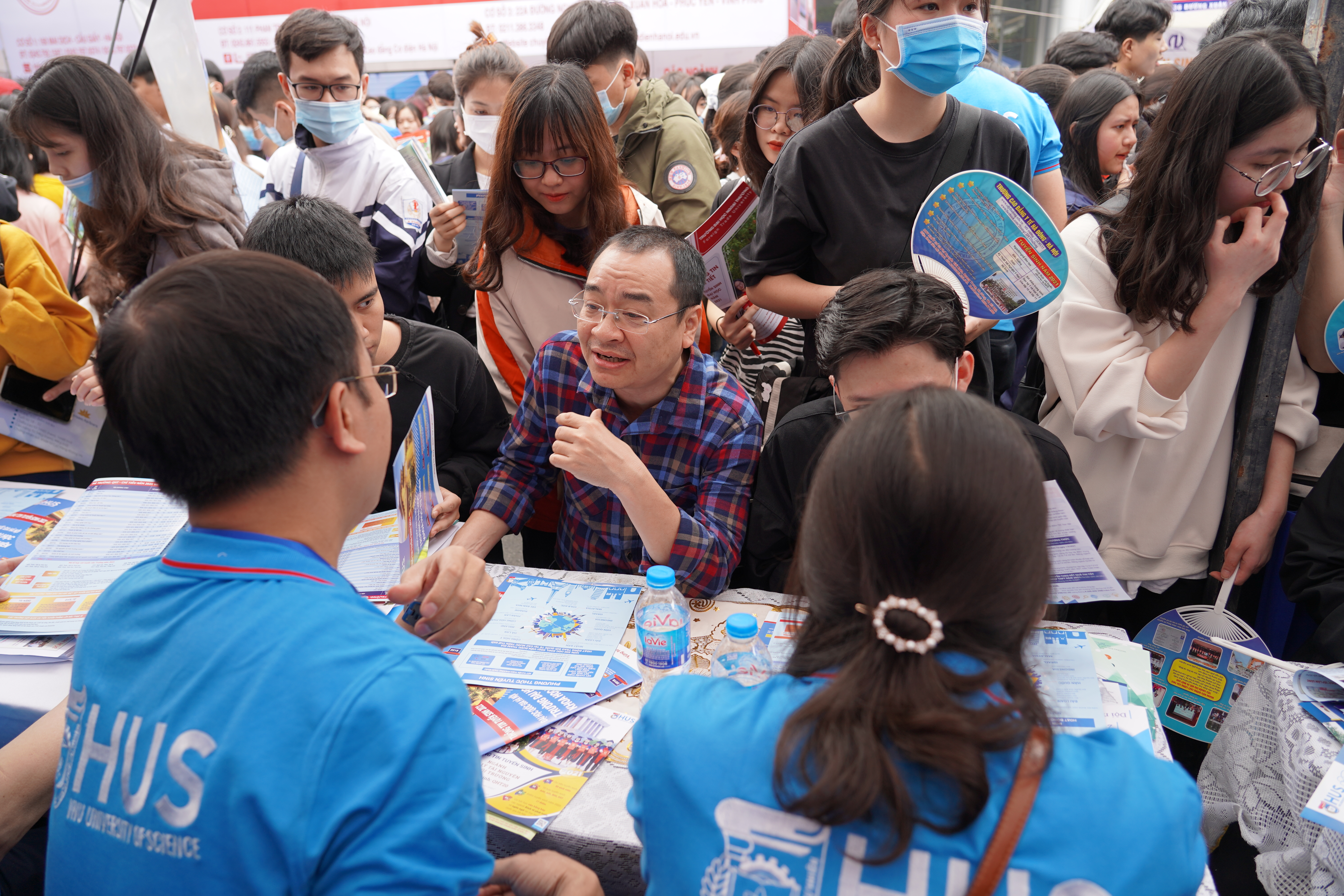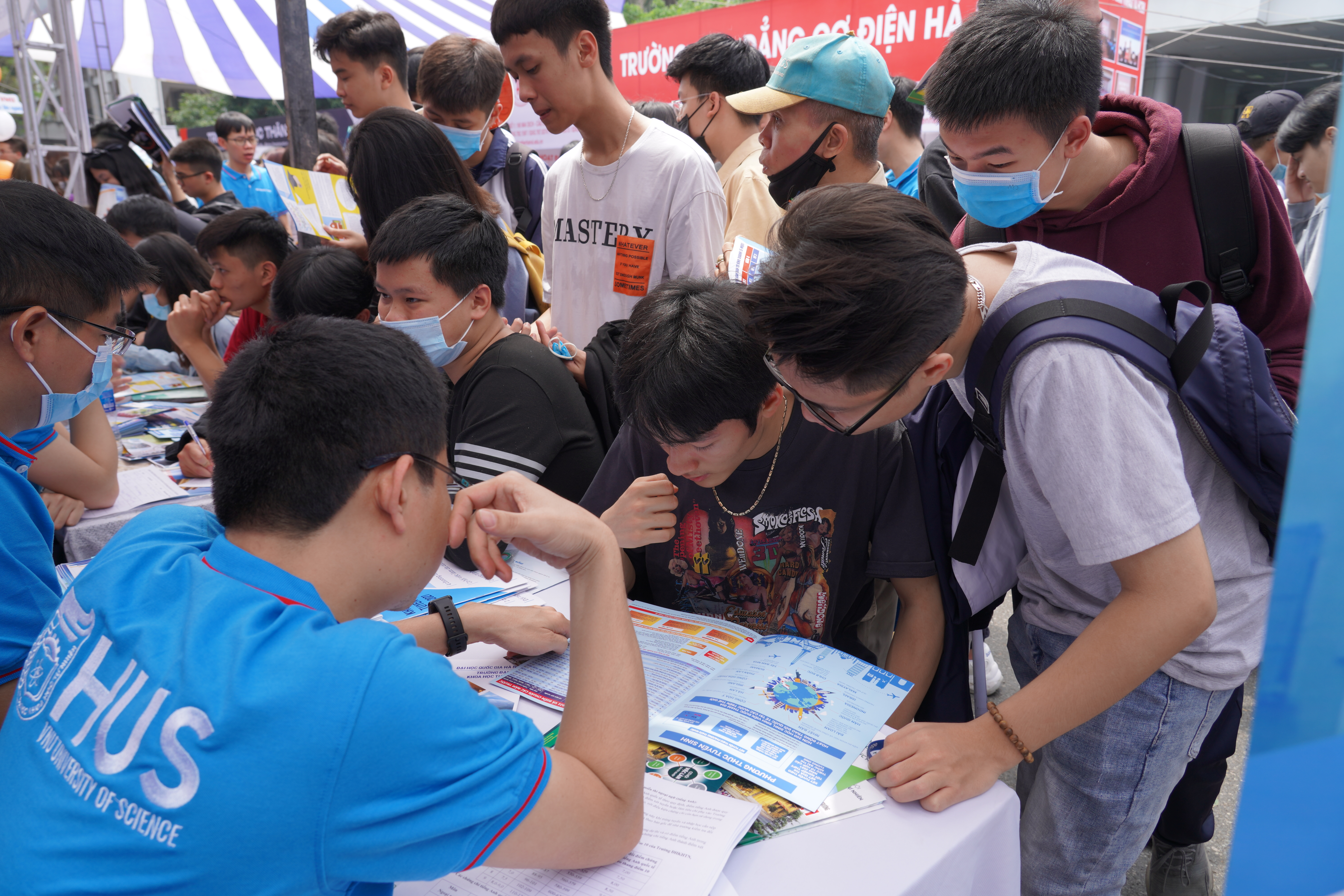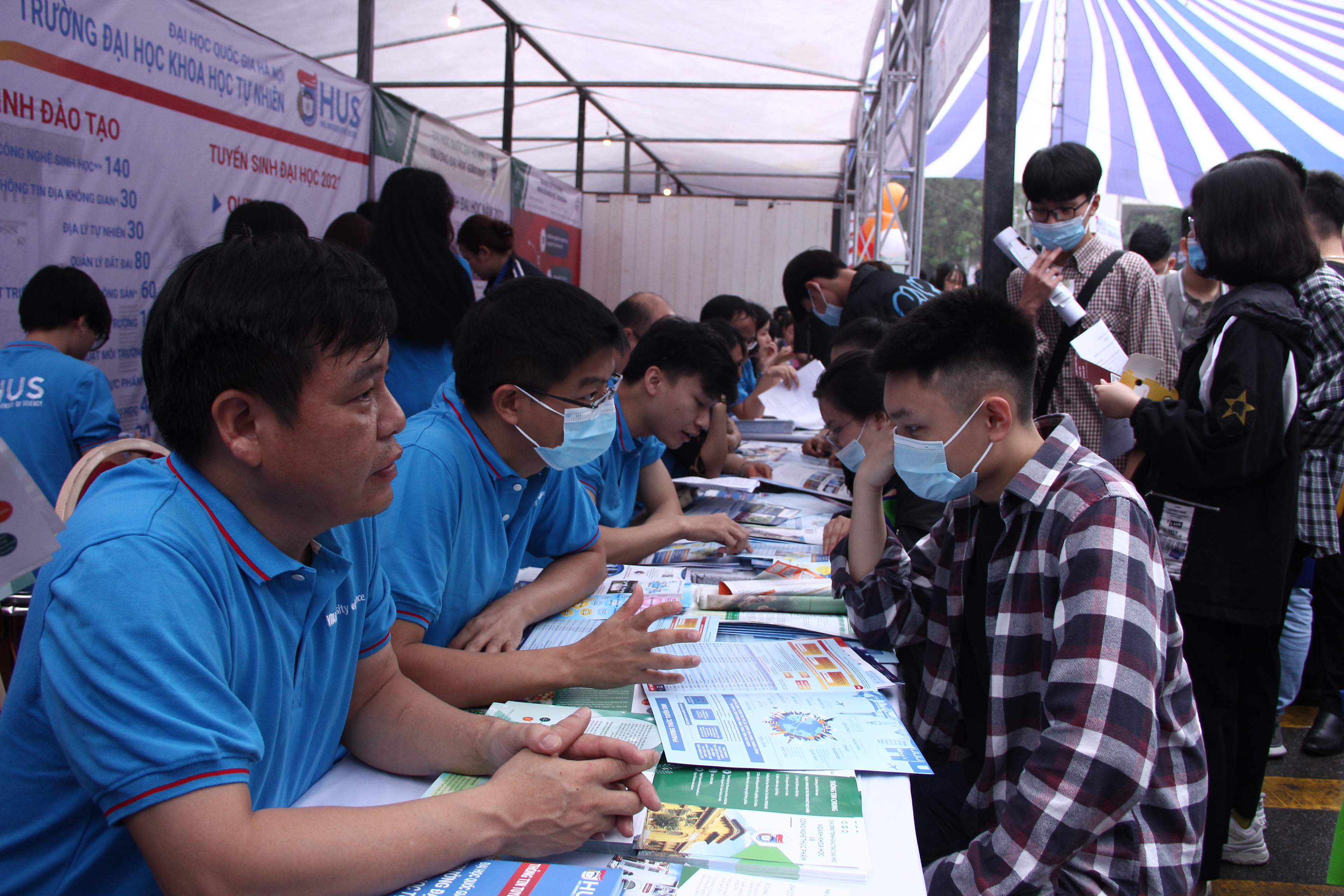 Ngoài những câu hỏi về các ngành cụ thể, một số học sinh khi đến gian hàng của Trường ĐHKHTN bày tỏ băn khoăn chưa biết chọn ngành nào phù hợp. Không ít em mang khuôn mặt đăm chiêu, lo lắng bởi đang học lớp 12, ngày đăng ký xét tuyển đã cận kề, gặp nhiều áp lực trong học hành, lựa chọn,...