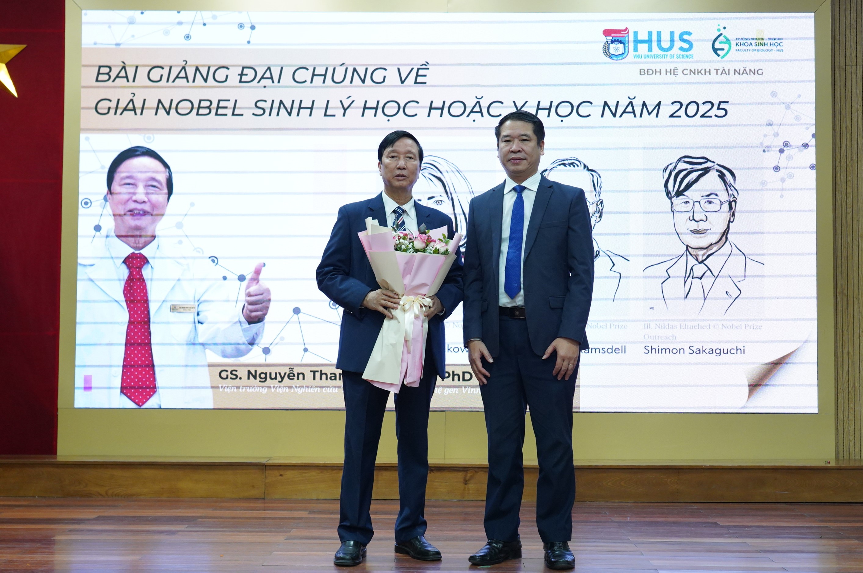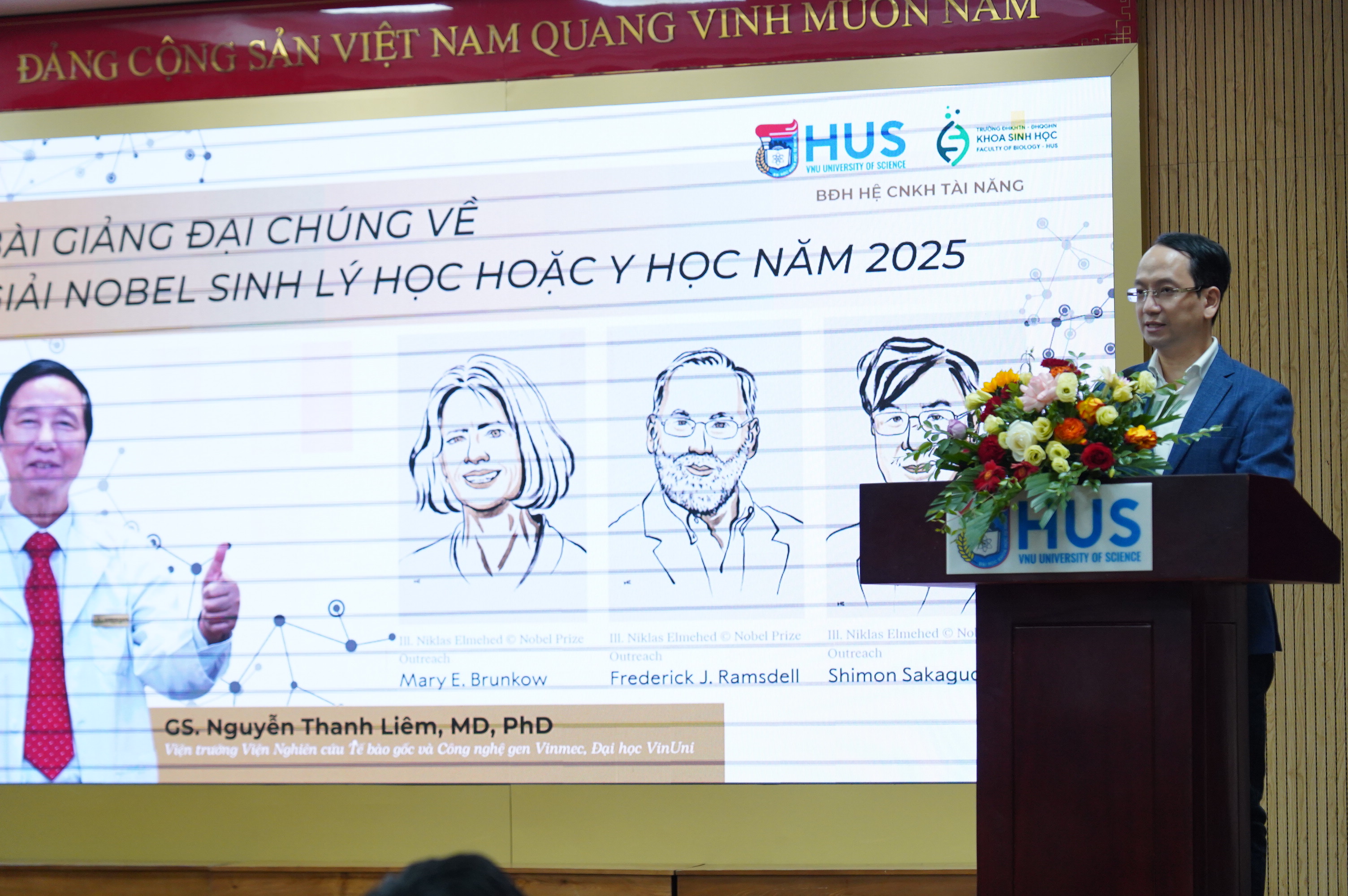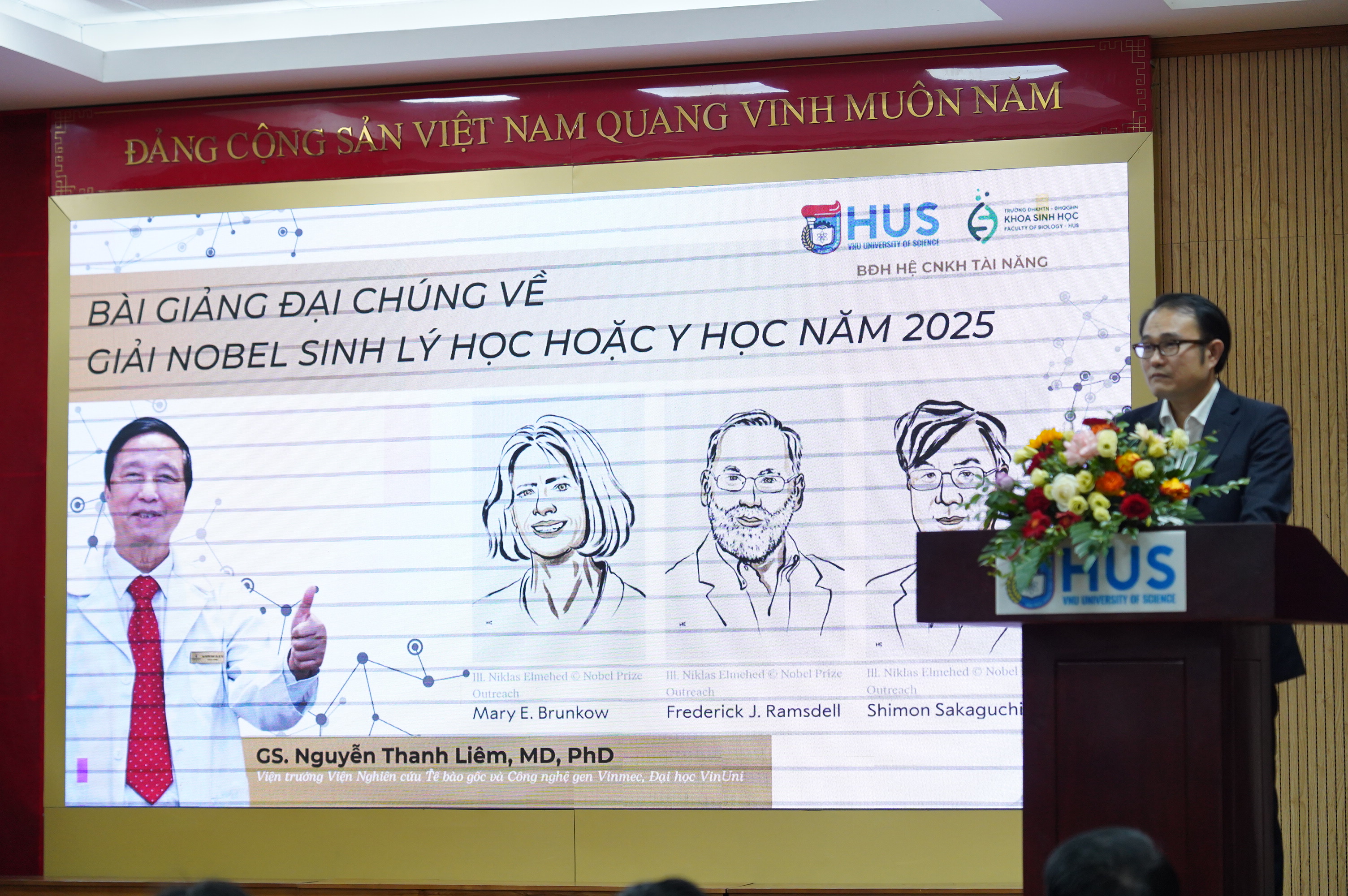 Ngày 21/11/2025, tại Trường ĐHKHTN – ĐHQGHN đã diễn ra chương trình Bài giảng đại chúng về giải Nobel Sinh lý học hoặc Y học năm 2025. Diễn giả của chương trình là GS.TS. Nguyễn Thanh Liêm, Viện trưởng Viện Nghiên cứu Tế bào gốc và Công nghệ gen Vinmec, Đại học VinUni. Chương trình do Ban điều hành Hệ Cử nhân khoa học tài năng và Khoa Sinh học tổ chức.