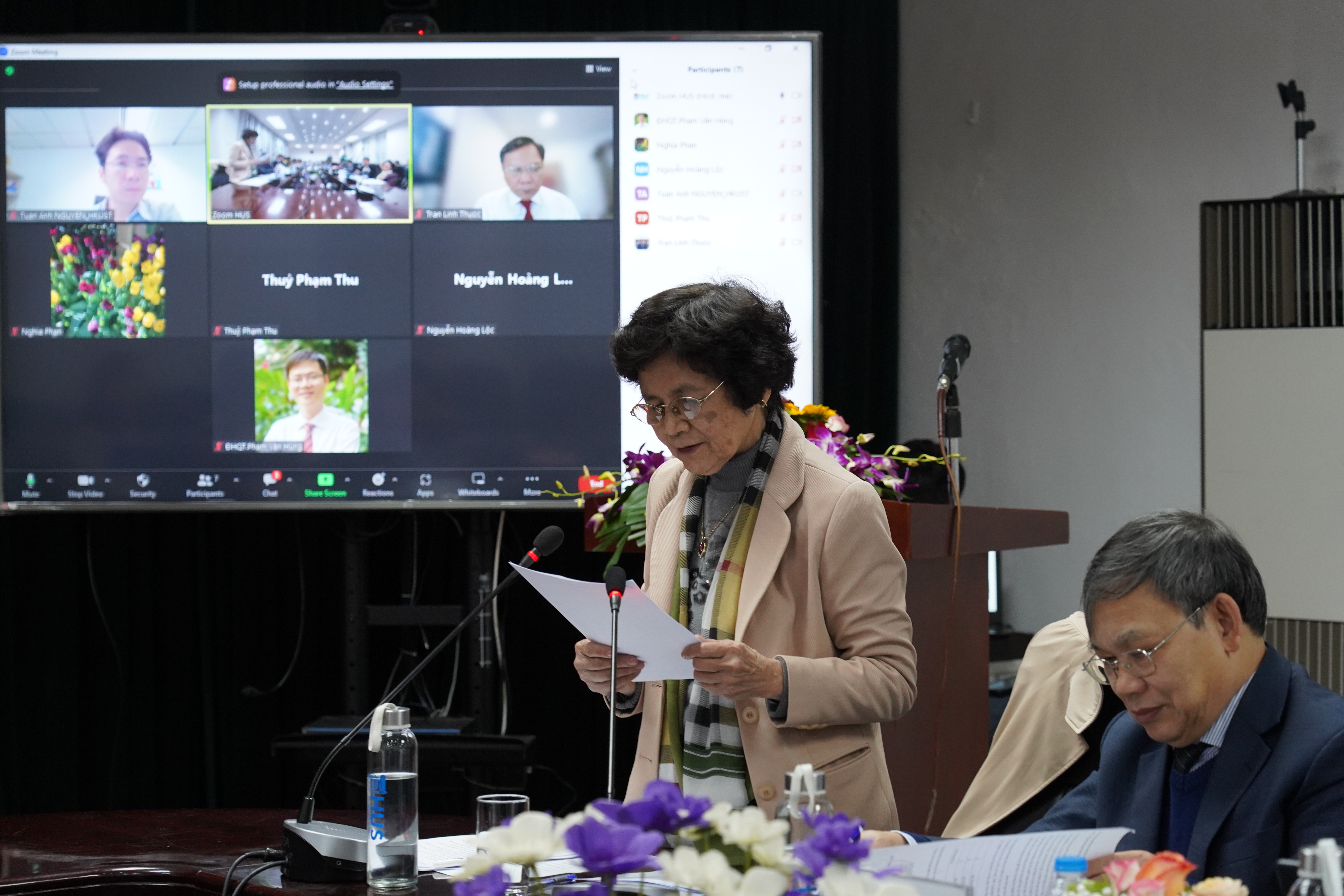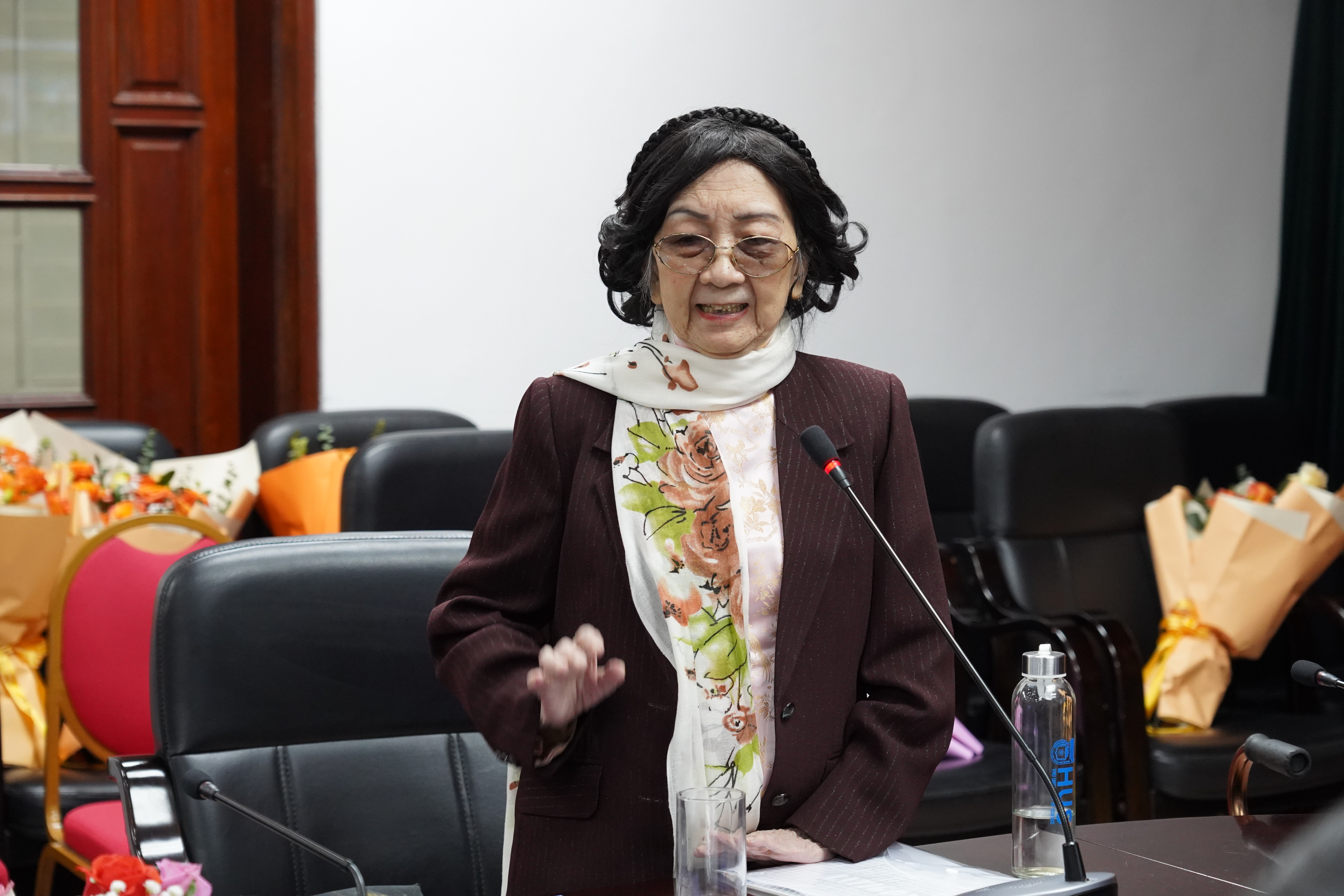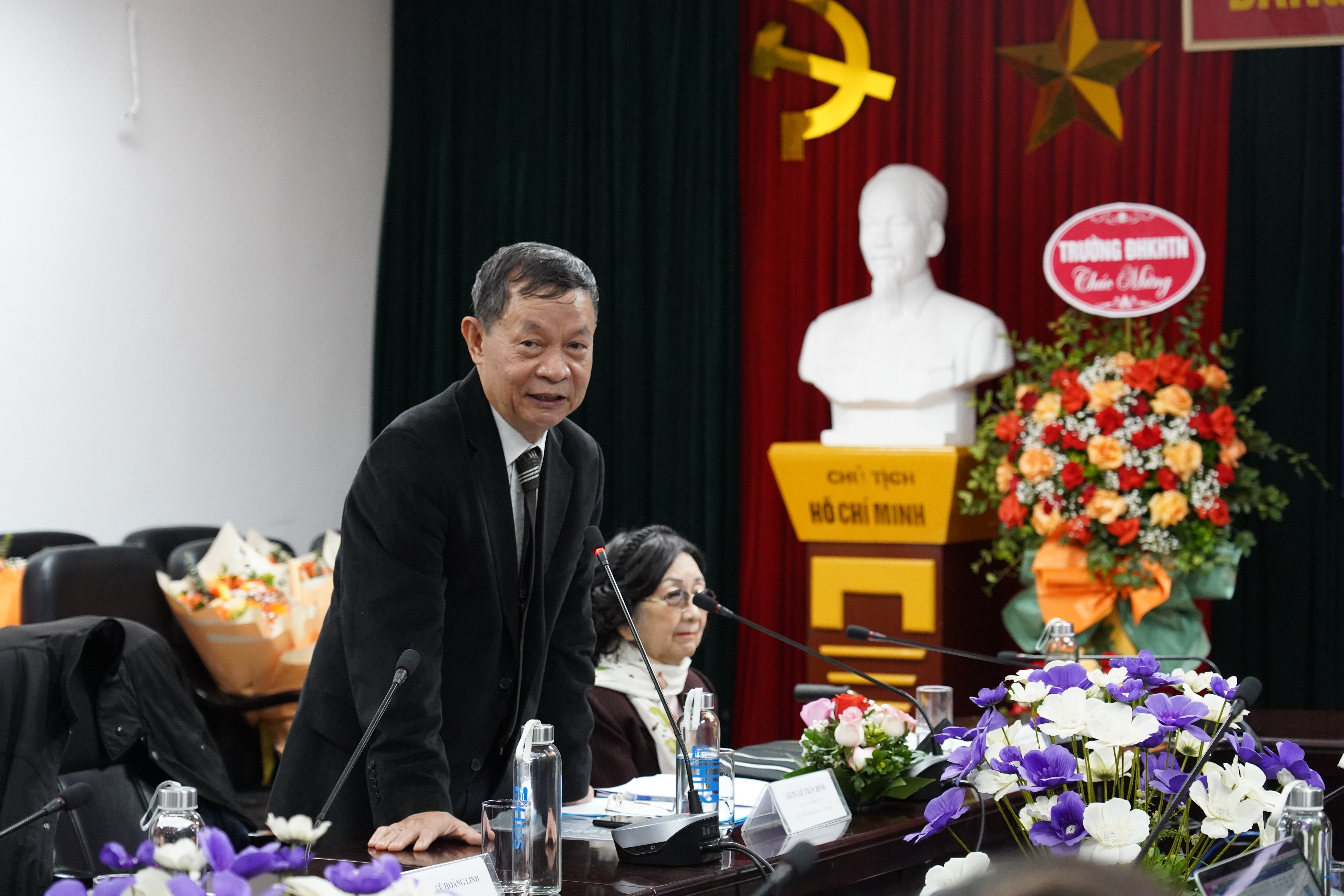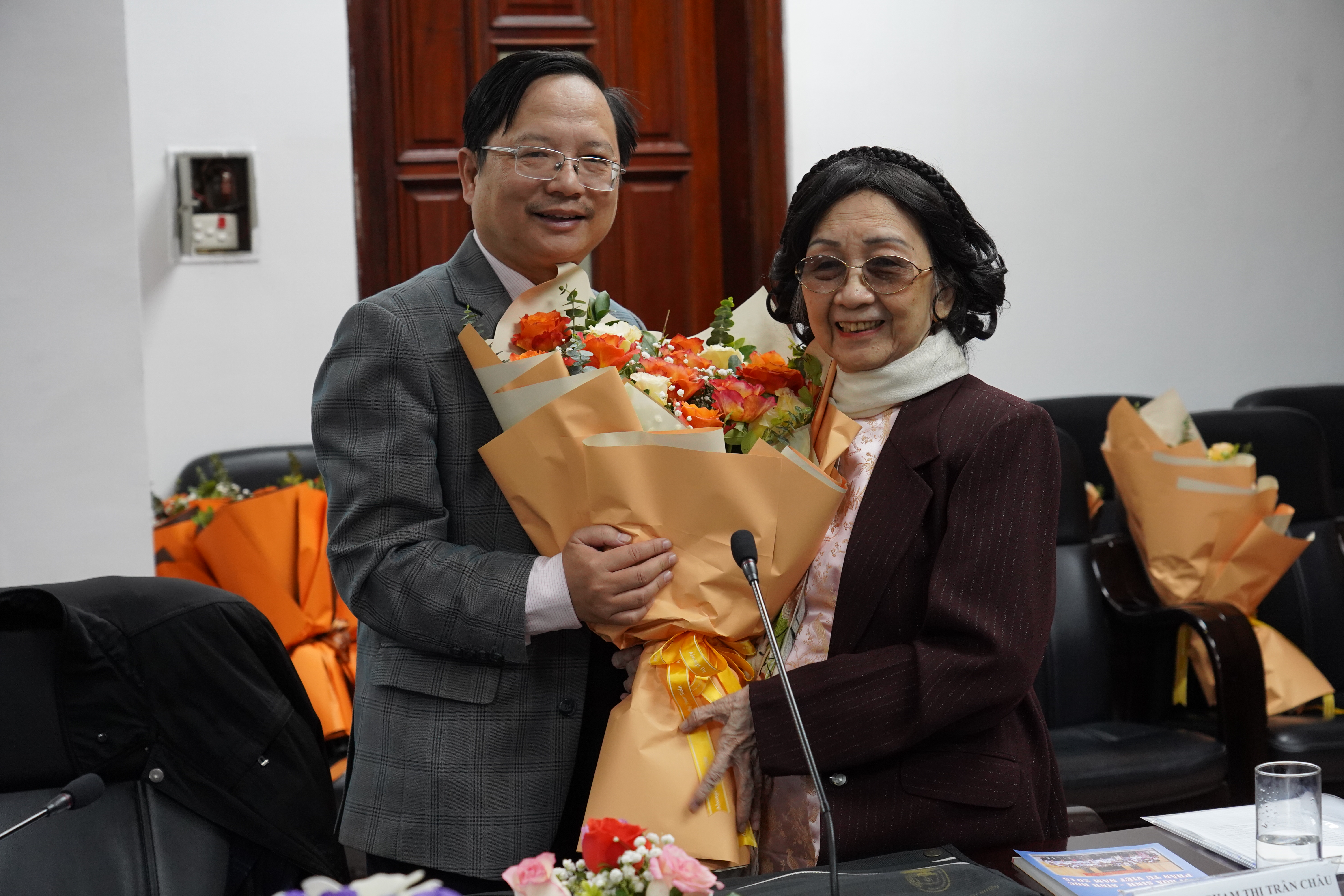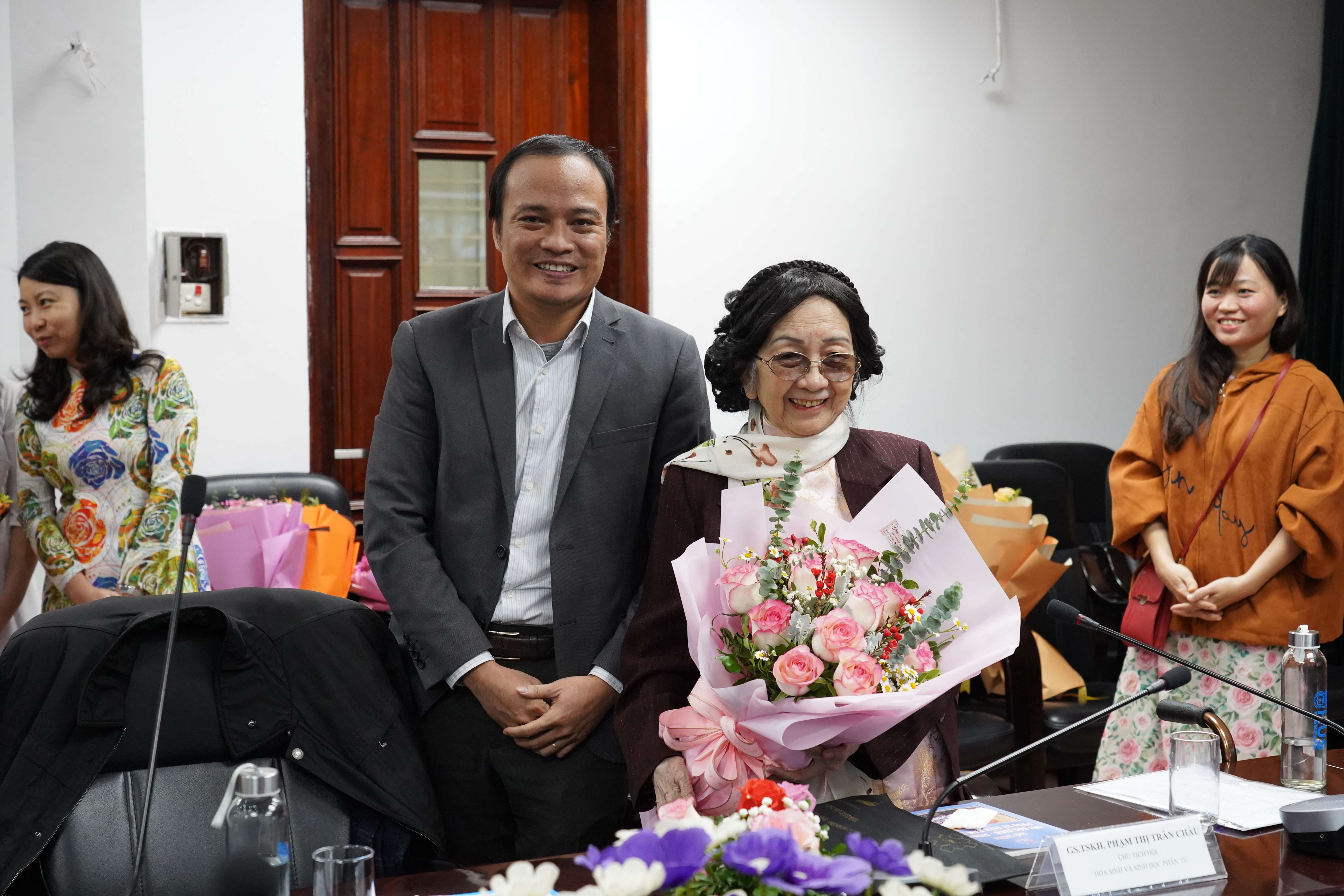 GS.TSKH. Vũ Hoàng Linh, Bí thư Đảng ủy, Hiệu trưởng Trường ĐHKHTN trao tặng bó hoa tươi thắm tới GS.TSKH. Phạm Thị Trân Châu thay lời tri ân vì những đóng góp của giáo sư cho Hội Hóa sinh và Sinh học phân tử Việt Nam cũng như cho các hoạt động tại Trường ĐHKHTN.