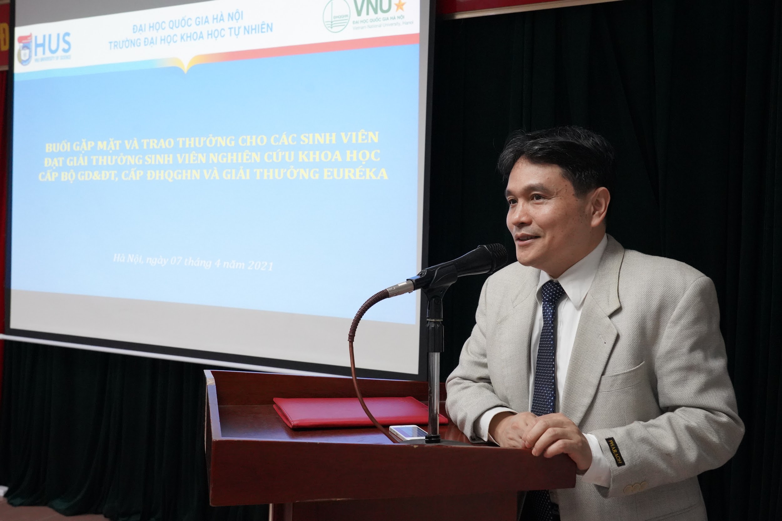 Phát biểu chào mừng tại buổi gặp mặt, PGS.TS. Trần Quốc Bình khẳng định: “nghiên cứu khoa học sinh viên là một trong những nhiệm vụ trọng tâm của một trường đại học nghiên cứu, nhất là trường đại học nghiên cứu hàng đầu tại Việt Nam như Trường Đại học Khoa học Tự nhiên. Thông qua hoạt động nghiên cứu khoa học, các bạn sinh viên sẽ củng cố thêm những kiến thức đã học, vận dụng những kiến thức đó vào giải quyết những vấn đề thực tiễn và quan trọng hơn là tạo ra niềm đam mê sáng tạo, khám phá, tìm tòi của các em. Từ đó giúp các bạn sinh viên định hướng cho công việc tương lai sau khi tốt nghiệp đại học.”