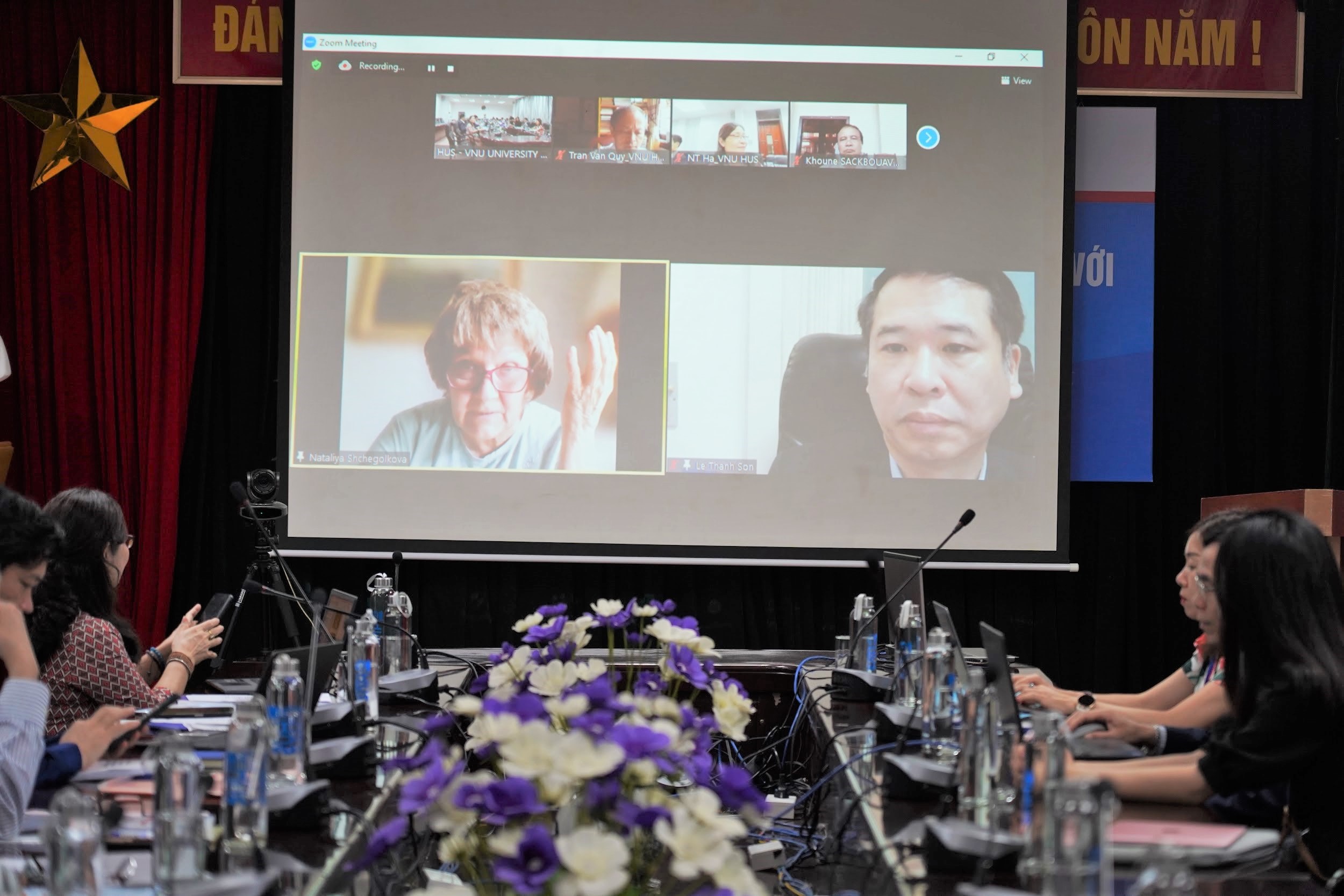 GS.TS. Lê Thanh Sơn, Phó Hiệu trưởng Trường Đại học Khoa học Tự nhiên (bên phải trên màn hình) và GS.TS. Nataliya Shchegolkova, Trường Đại học Tổng hợp Lomonosov Moscow, điều phối dự án phía Nga (bên trái trên màn hình) phát biểu khai mạc hội thảo
