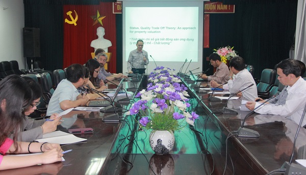 Tiếp đó, các giáo sư đến từ Khoa Địa lý, Đại học Leeds phối hợp cùng Khoa Địa lý, Trường Đại học Khoa học Tự nhiên tổ chức buổi hội thảo khoa học với chủ đề “Tính toán chỉ số giá bất động sản ứng dụng lý thuyết Vị thế - Chất lượng”. Một số nội dung được trình bày và thảo luận tại hội thảo gồm: Phân tích dữ liệu không gian và thời gian – tổng quan và ứng dụng; Tái cấu trúc đô thị ở California; Phương pháp mới trong định giá bất động sản trên cơ sở lý thuyết vị thế chất lượng,…