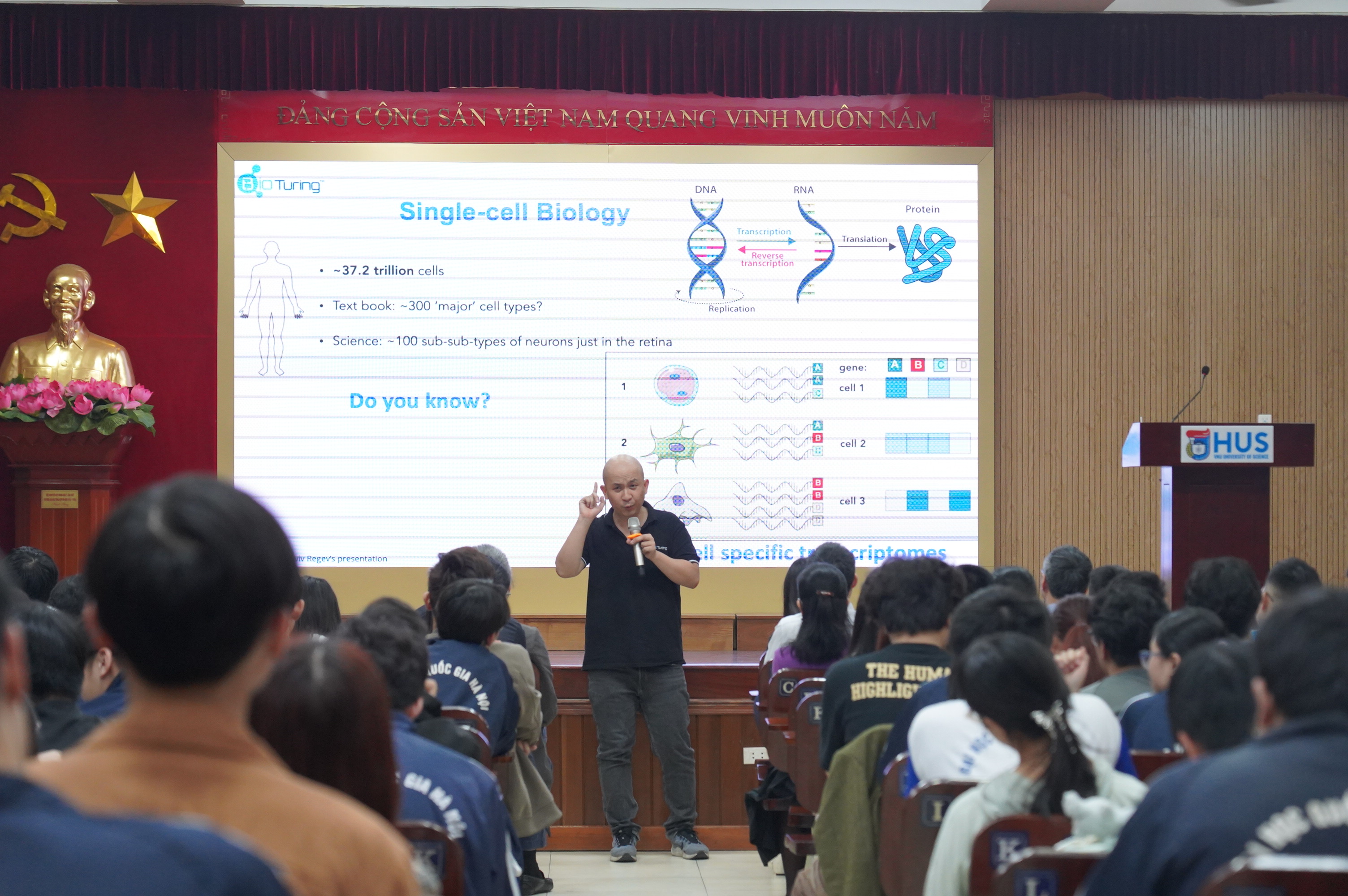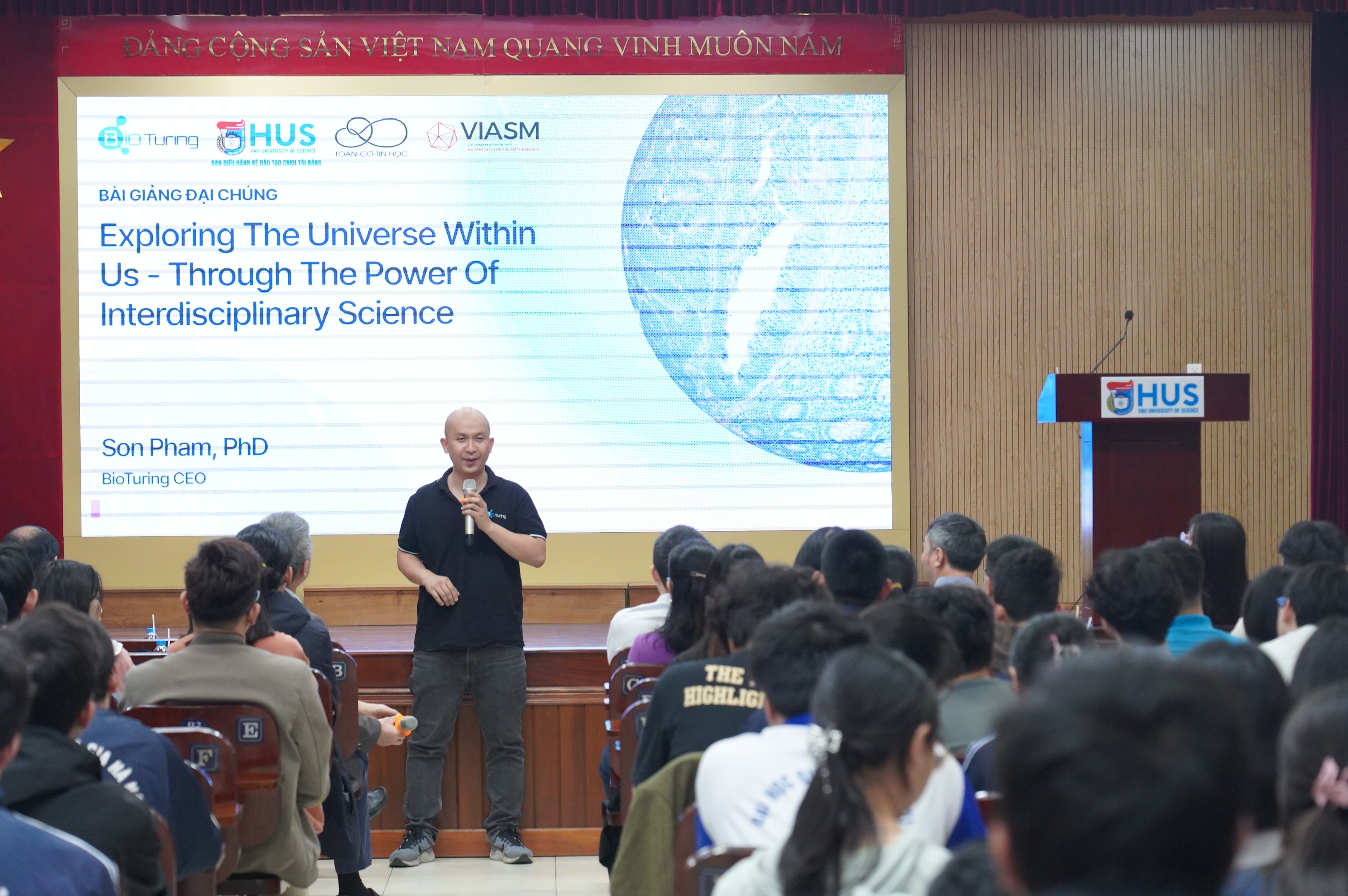 Chiều ngày 04/03/2025, tại Trường ĐHKHTN đã diễn ra chương trình Bài giảng đại chúng với chủ đề “Exploring The Universe Within Us – Through The Power Of Interdisciplinary Science” (Khám phá vũ trụ bên trong chúng ta thông qua sức mạnh của khoa học liên ngành). Diễn giả trình bày bài giảng là TS.Phạm Kim Sơn, CEO BioTuring (công ty Tin - Sinh học có trụ sở tại Hoa Kỳ).
