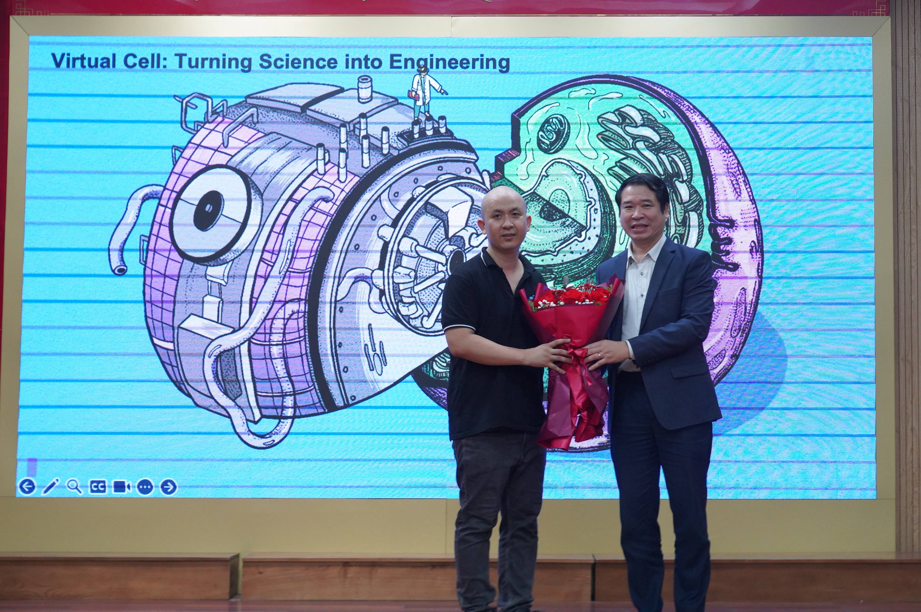 GS.TS.Lê Thanh Sơn, Phó Hiệu trưởng Trường ĐHKHTN tặng hoa sau khi diễn giả kết thúc bài giảng.