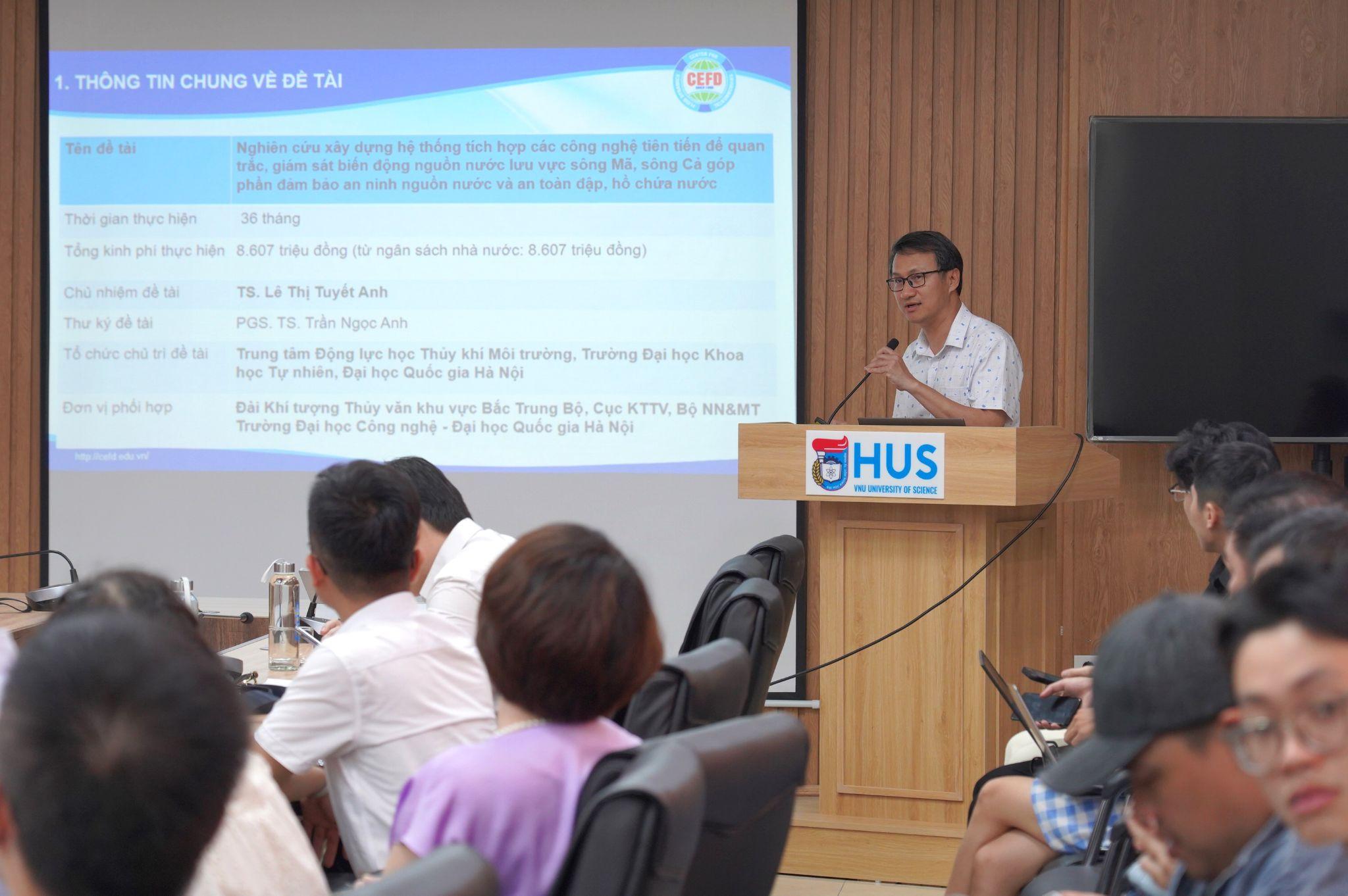 Tại hội thảo, PGS.TS. Trần Ngọc Anh, Giám đốc Trung tâm, Thư ký đề tài, đã giới thiệu chi tiết cấu trúc và định hướng nghiên cứu của đề tài. Theo đó, hệ thống giám sát sẽ được thiết kế theo hướng tích hợp các công nghệ tiên tiến như viễn thám, mô hình vật lý, học máy (machine learning) và trí tuệ nhân tạo (AI). Mục tiêu là xây dựng một nền tảng dữ liệu thống nhất, có khả năng xử lý và hiển thị biến động dòng chảy, tải lượng bùn cát và xâm nhập mặn tại lưu vực sông Mã và sông Cả gần thời gian thực, phục vụ hiệu quả công tác cảnh báo sớm và vận hành công trình thủy lợi.