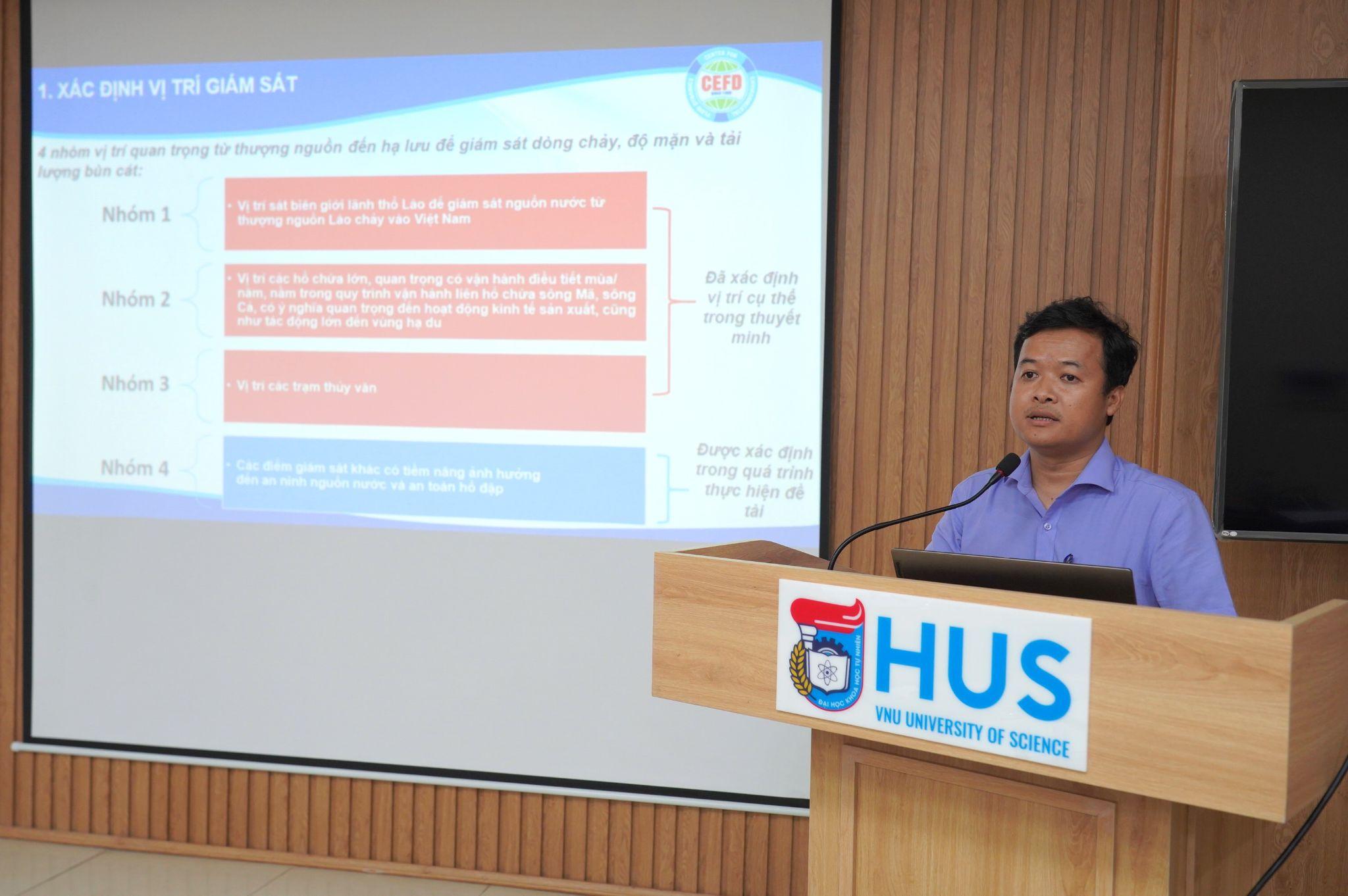 Đại diện nhóm thực hiện đề tài giới thiệu kết quả phân tích và lựa chọn các vị trí cần thiết giám sát cũng như các yếu tố thủy văn quan trọng cần được theo dõi định kỳ hoặc liên tục tại hai lưu vực sông Mã và sông Cả. Cụ thể bao gồm: dòng chảy (lưu lượng, mực nước), tải lượng bùn cát và độ mặn tại các khu vực có nguy cơ xâm nhập