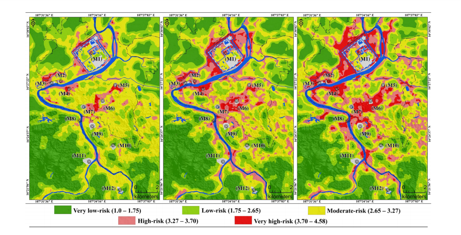 Bản đồ nguy cơ đối với giá trị nổi bật toàn cầu (OUV) của quần thể di tích cố đô Huế theo phân bố không gian. Từ trái qua là năm 1995, 2005 và 2016.