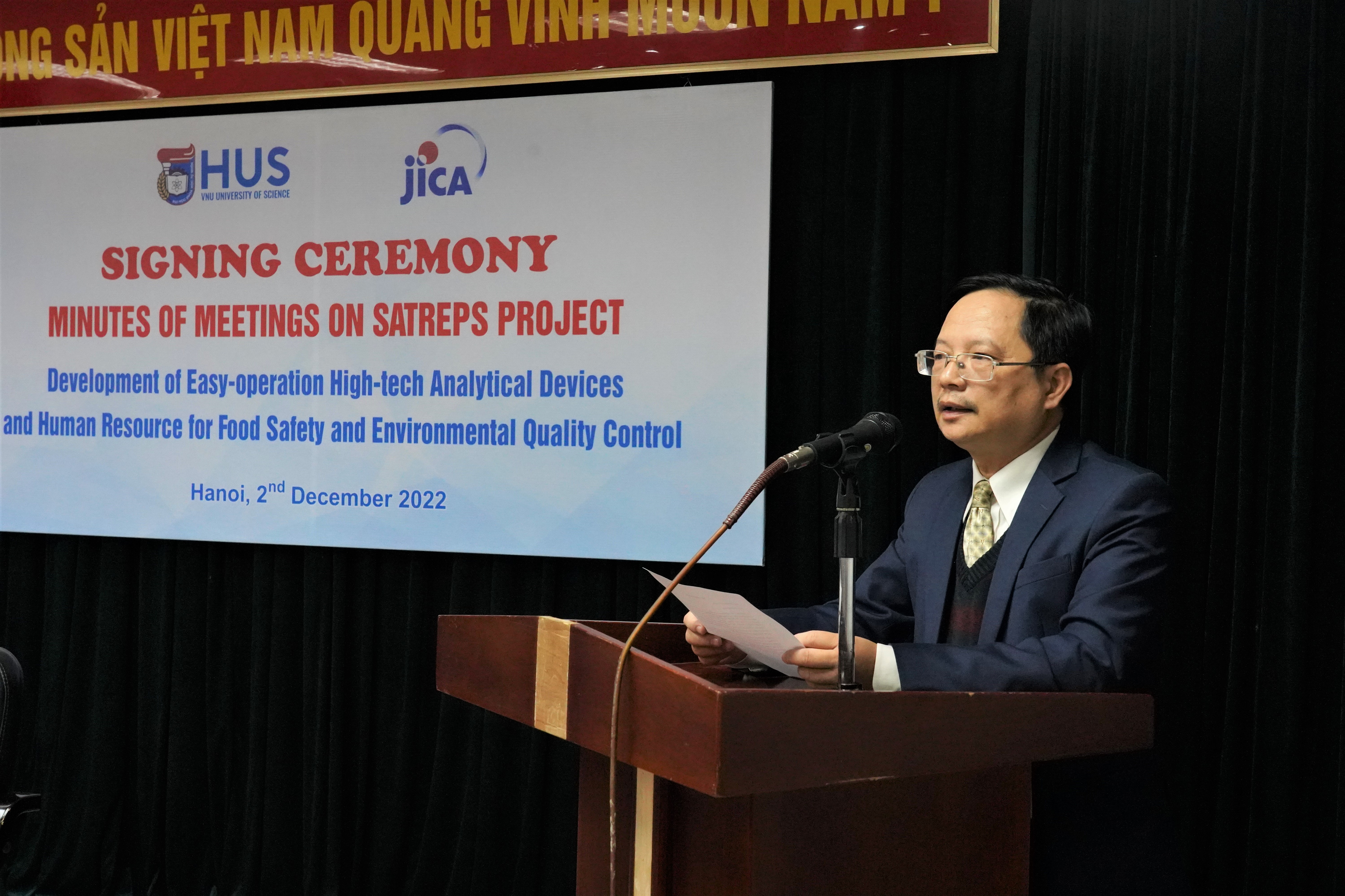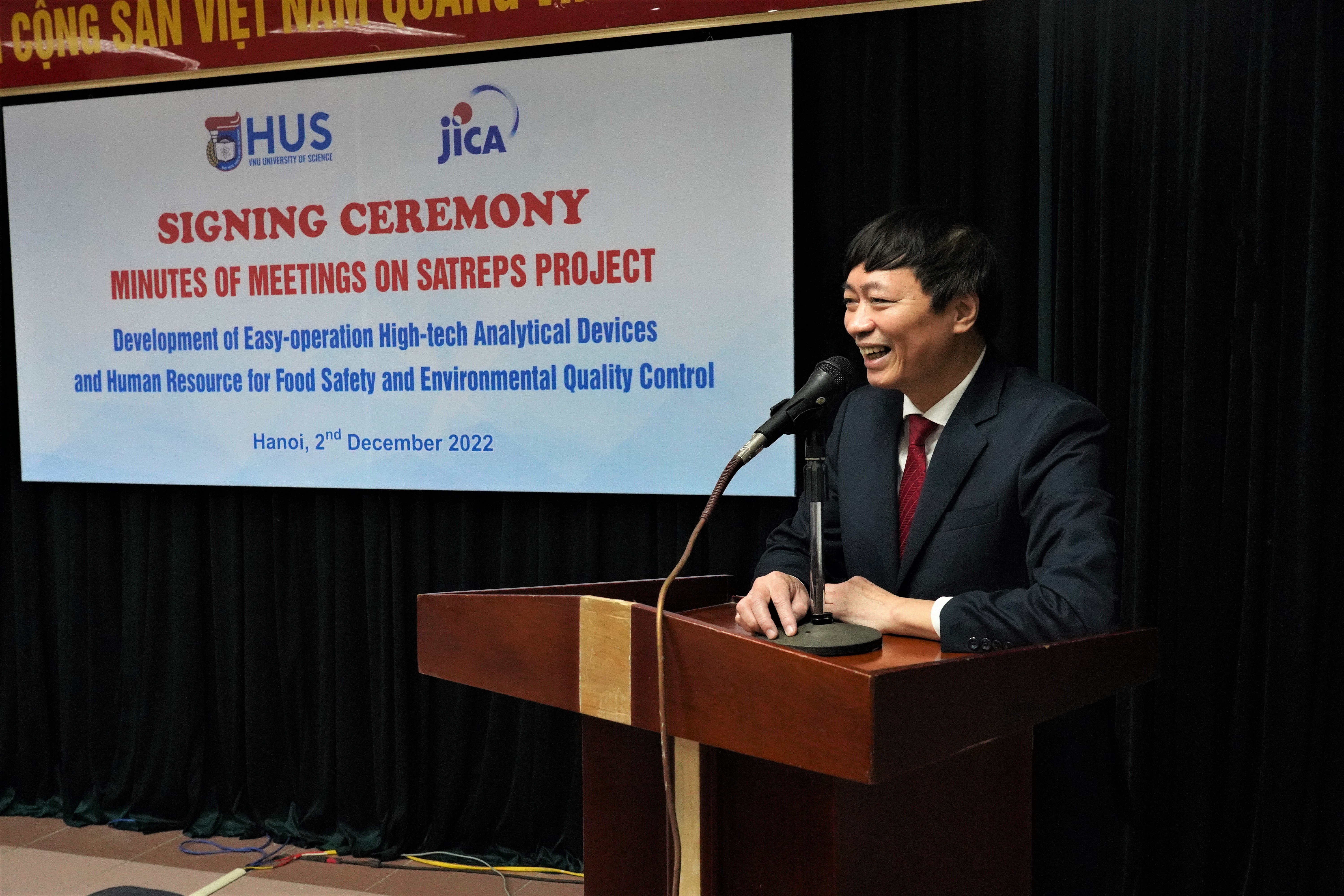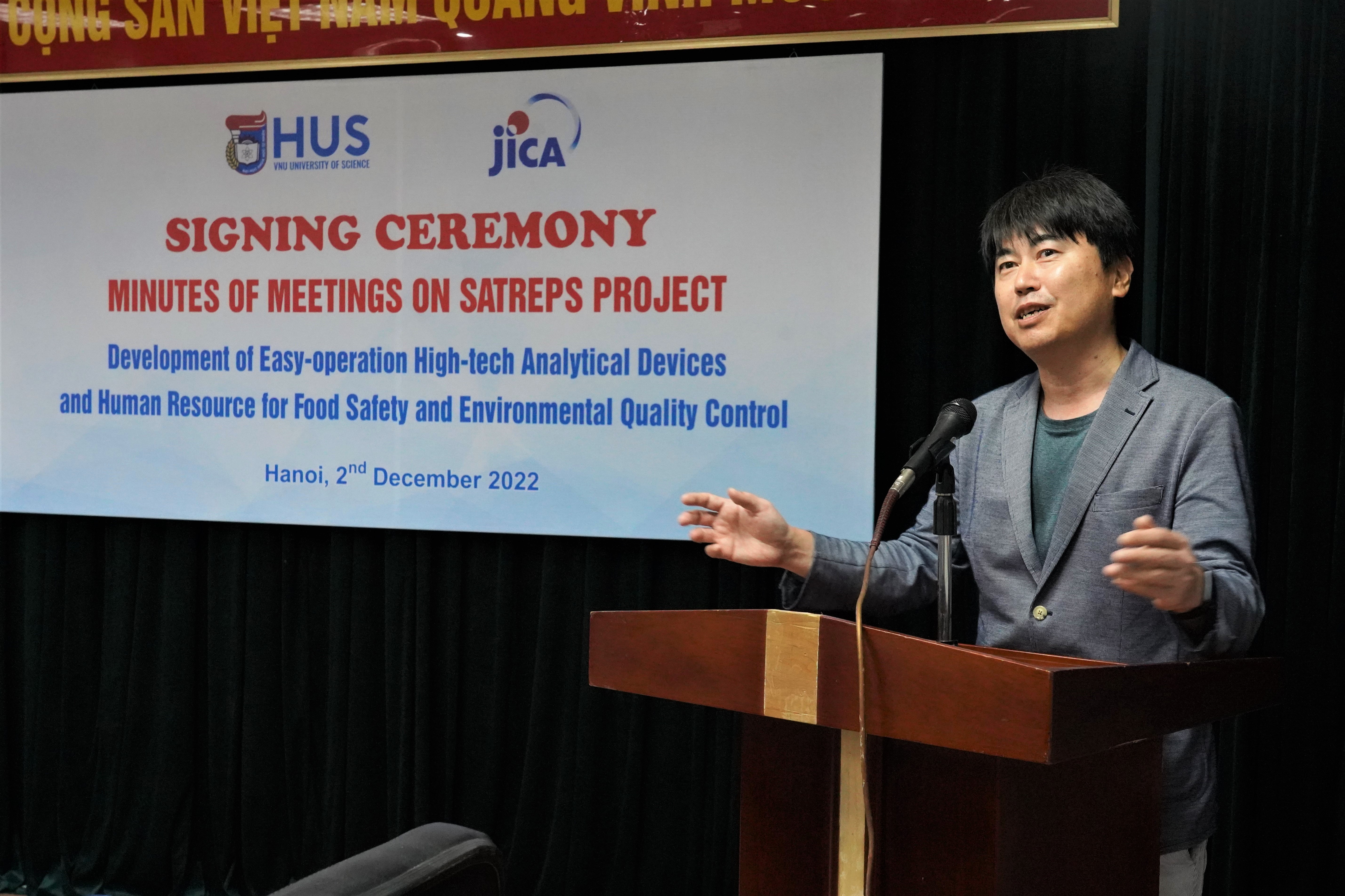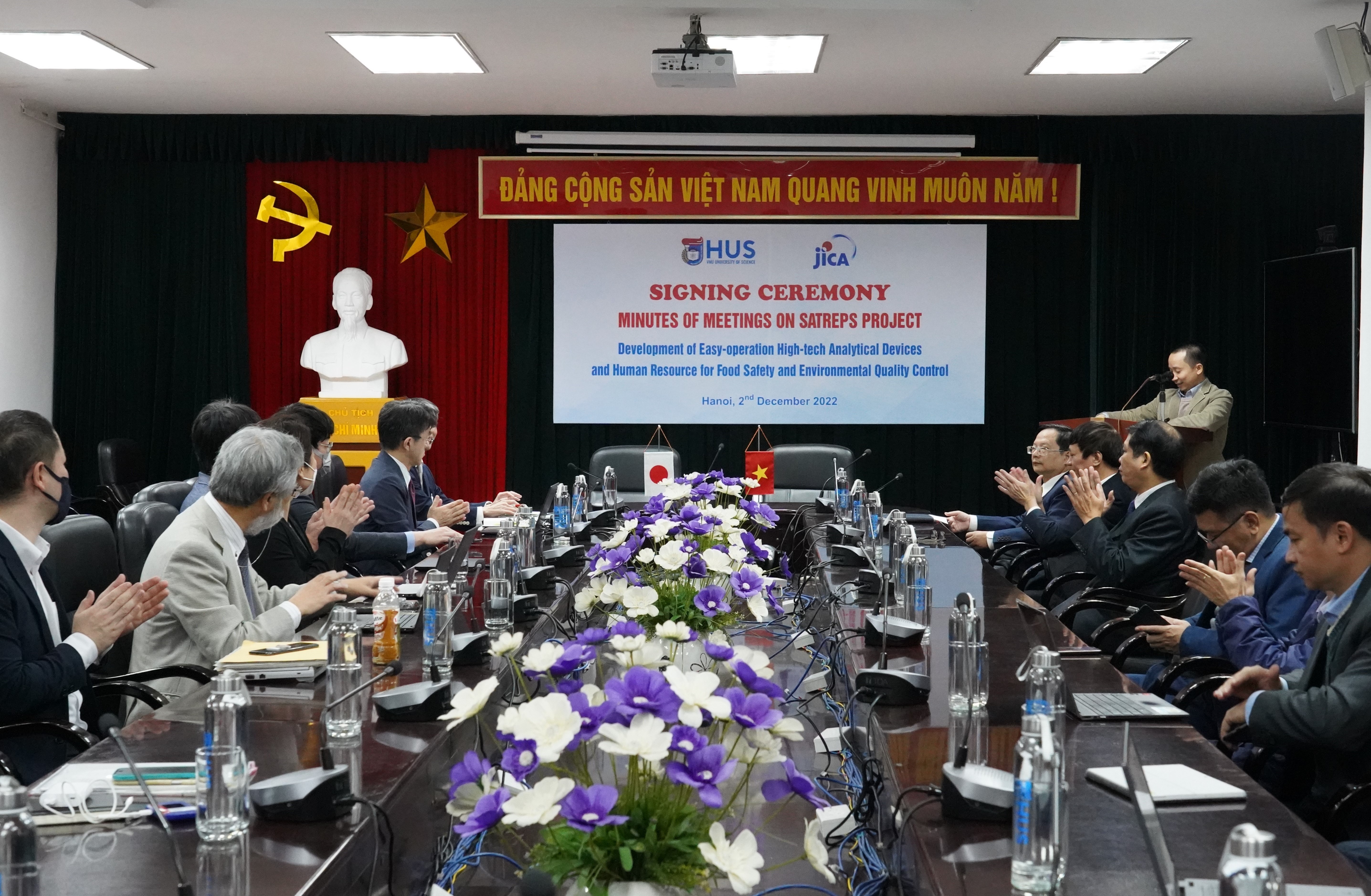 Sáng ngày 2/12/2022, tại Trường Đại học Khoa học Tự nhiên, Đại học Quốc gia Hà Nội (ĐHKHTN, ĐHQGHN) đã diễn ra Lễ ký kết biên bản làm việc về Dự án SATREPS “Phát triển công nghệ cao chế tạo thiết bị phân tích nhanh, dễ sử dụng và tăng cường nguồn nhân lực phục vụ kiểm soát an toàn thực phẩm và chất lượng môi trường” giữa Nhà trường và Đoàn khảo sát thuộc Cơ quan Hợp tác Quốc tế Nhật Bản (JICA).