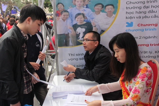Đối với Trường ĐHKHTN, nhiều học sinh đặt câu hỏi về những ngành có chương trình đào tạo tiên tiến, chất lượng cao, chương trình đạt chuẩn quốc tế có liên kết với các đối tác là các trường đại học uy tín trên thế giới. Các câu hỏi tập trung về: điểm thi tuyển, xét tuyển; ưu đãi khi học các chương trình này; cơ hội được thực tập, du học tại các trường đối tác,… đã được đại diện nhà trường tư vấn cụ thể. Giải đáp sự quan tâm của học sinh tới các hình thức đào tạo đặc biệt nhằm tiết kiệm thời gian “ngành kép” của Trường, TS. Trịnh Thị Thúy Giang – Trưởng phòng CT&CTSV cho biết “Để tạo điều kiện cho sinh viên có thể tốt nghiệp hai ngành, ĐHQG Hà Nội cho phép những sinh viên đạt kết quả tích lũy tín chỉ được học thêm một ngành thứ hai (học ngành kép). Có thể học hai ngành trong một trường hoặc hai ngành ở 2 trường thành viên của ĐHQG Hà Nội”. Ví dụ, sinh viên học ngành Địa lý của Trường ĐHKHTN có thể học thêm “ngành kép” Địa chính ngay trong cùng Khoa; sinh viên học ngành Khí tượng của Trường ĐHKHTN có thể học thêm “ngành kép” Công nghệ thông tin của ĐH Công nghệ - ĐHQGHN.