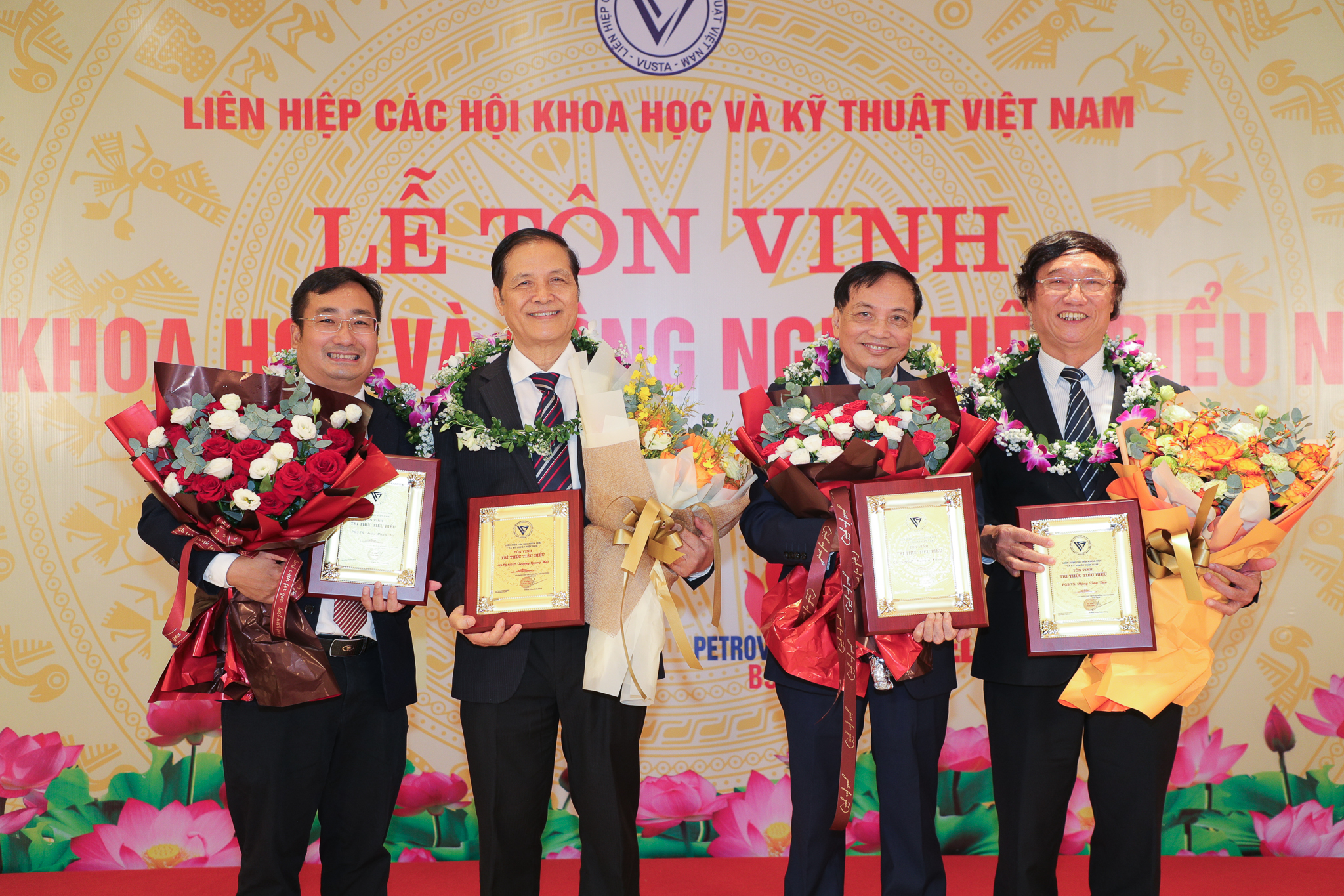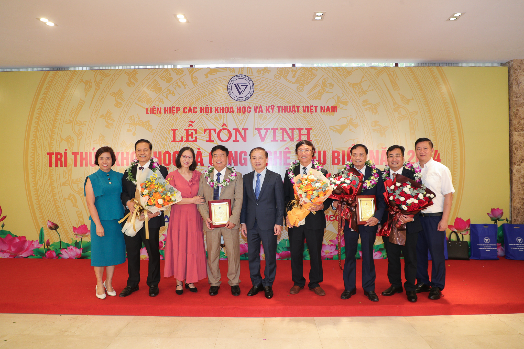 Đại diện Lãnh đạo Ban Khoa học & Công nghệ, Ban Xúc tiến Đầu tư ĐHQGHN tặng hoa chúc mừng các nhà trí thức ĐHQGHN được vinh danh.