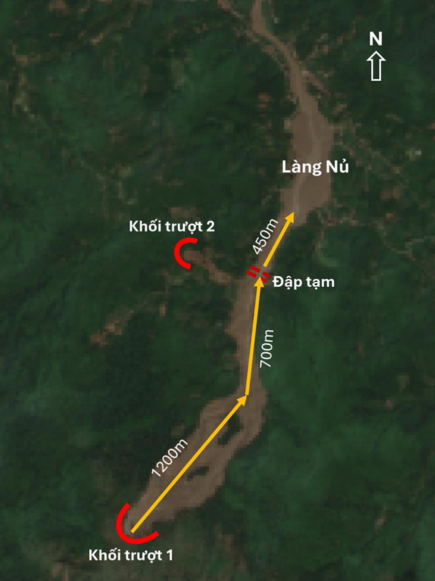 TS. Ngô Văn Liêm: Hiện có khá nhiều thông tin về những tiếng nổ và tiếng di chuyển lục cục của đất đá trong dòng lũ bùn đá. Các thông tin đó đều rất quý cho nhận định hiện trạng và cho cảnh báo thảm họa lũ bùn đá. Tổng hợp các thông tin có thể thấy điểm chung là có hai tiếng nổ lớn. Với kiến thức chuyên môn, có thể nhận định tiếng nổ thứ nhất là do khối trượt lở đất, đá lớn ở phía gần đỉnh của khối núi Con Voi (nơi xuất phát của dòng bùn đá, khối trượt lở 1). Tiếng nổ thứ hai là sự phá vỡ một đập chắn tạm thời được hình thành ở đoạn thắt gần cuối thung lũng (cách làng Nủ 400-500m). Đập chắn này được hình thành do nguồn vật chất từ các khối trượt lở trên sườn thung lũng (khối trượt lở 2) cùng các vật liệu do dòng chảy suối mang đến. Đập chắn này có thể được hình thành không lâu trước đó, hoặc có thể chỉ ngay sau khi khối trượt lở ở phía trên đỉnh xảy ra đã kích thích gây ra khối trượt lở 2).