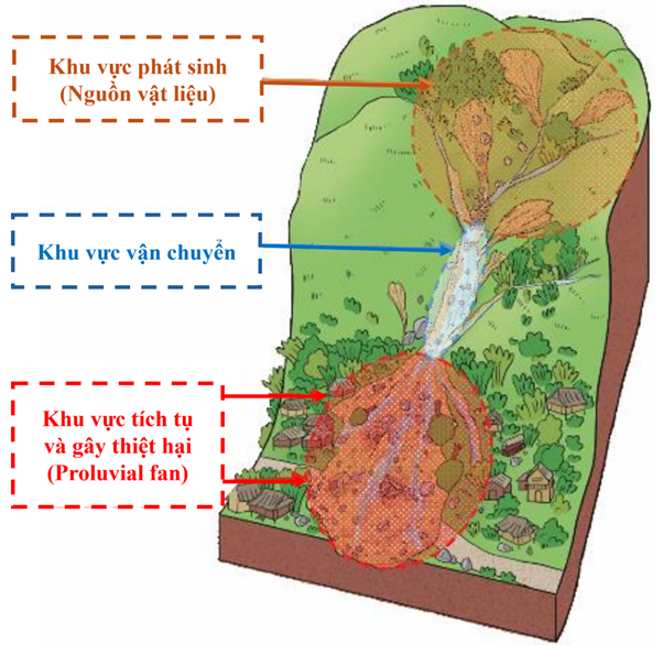 Ảnh: Mô hình khái quát của dòng lũ bùn đá (gồm 3 bộ phận chính: khu vực phát sinh/khu vực cung cấp nguồn vật liệu bùn đá, khu vực vận chuyển và khu vực tích tụ và gây thiệt hại chính).
