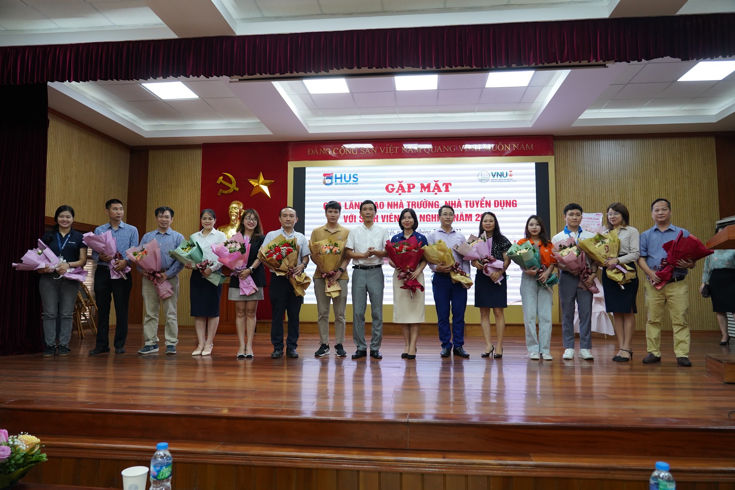 PGS.TS. Ngạc An Bang - Phó Hiệu trưởng Nhà trường tặng hoa cảm ơn đại diện các doanh nghiệp, nhà tuyển dụng tham dự chương trình