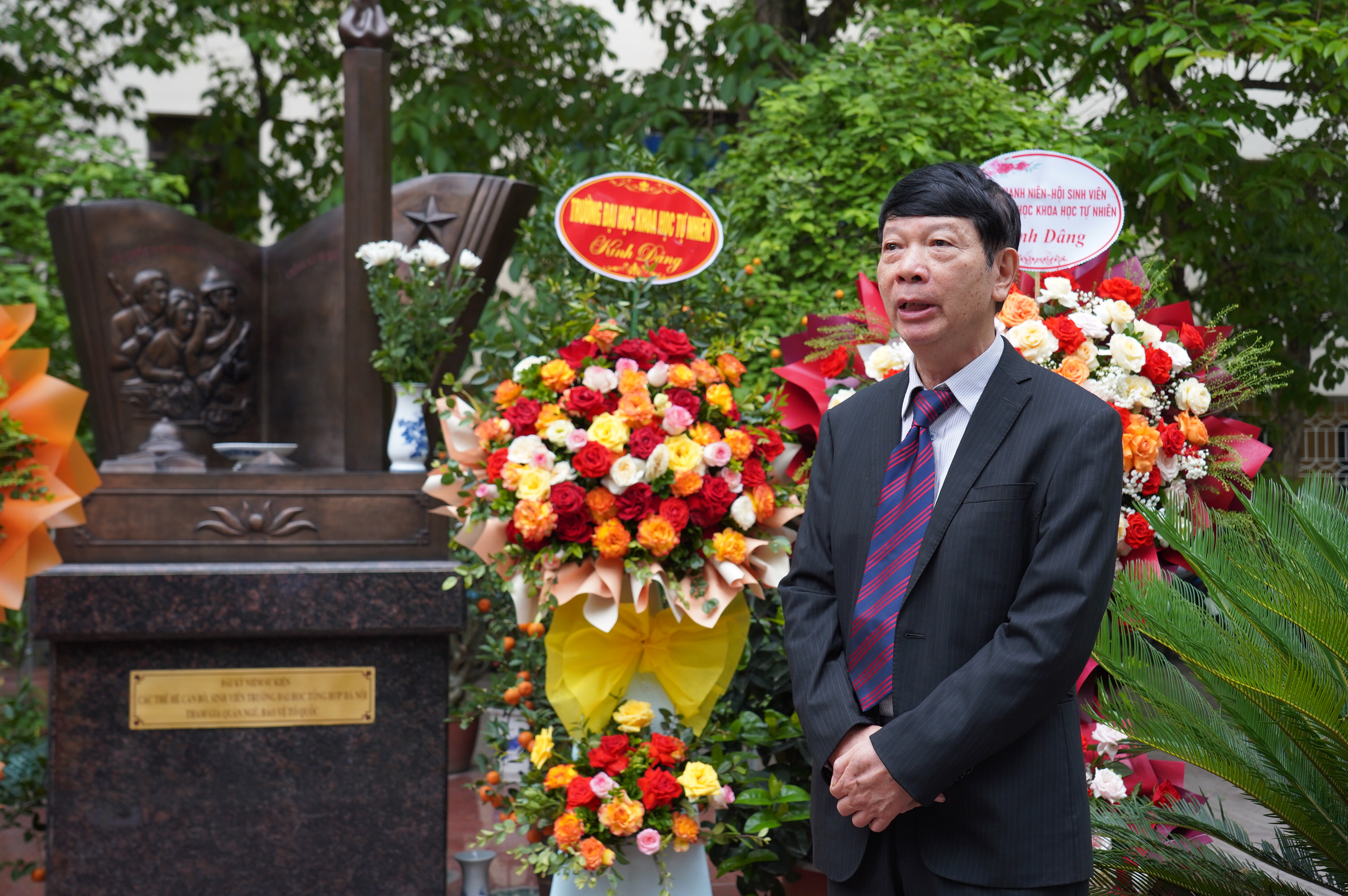 Phát biểu tại buổi lễ, GS.TSKH. Vũ Hoàng Linh, Bí thư Đảng uỷ, Hiệu trưởng Nhà trường, chia sẻ: "Trong không khí hân hoan của cả nước kỷ niệm 50 năm ngày Giải phóng miền Nam, thống nhất đất nước, Trường ĐHKHTN tổ chức lễ dâng hoa để tưởng nhớ, ghi ơn và tri ân các thế hệ cán bộ, sinh viên Trường Đại học Tổng hợp Hà Nội trước đây đã xếp bút nghiên lên đường chiến đấu bảo vệ Tổ quốc. Hy vọng rằng, các thế hệ cán bộ, giảng viên, sinh viên Nhà trường hôm nay sẽ luôn ghi nhớ, trân quý nền hoà bình quý giá và tiếp nối sự nghiệp xây dựng đất nước, góp sức mình vào công cuộc xây dựng đất nước ngày càng giàu đẹp, phồn vinh thông qua các hoạt động đào tạo, nghiên cứu khoa học...”