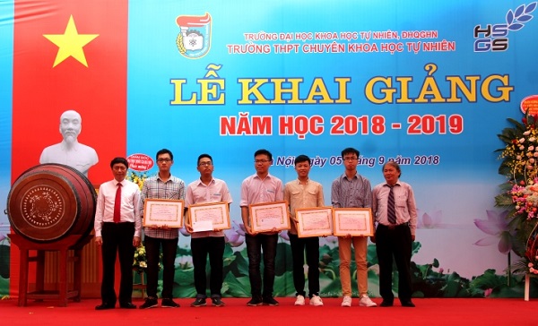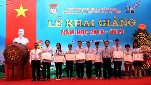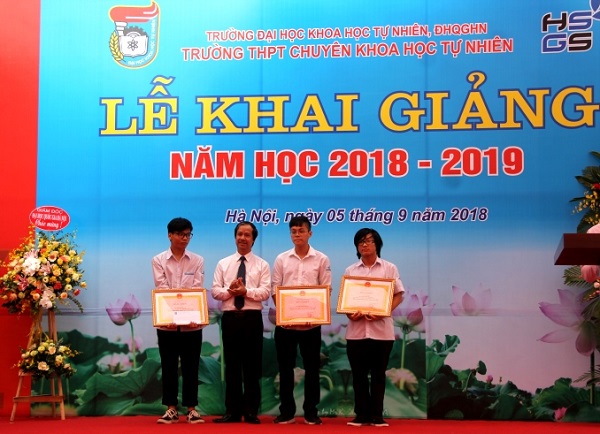 Trong khuôn khổ buổi lễ, lãnh đạo ĐHQGHN, Trường ĐHKHTN và Trường THPT Chuyên Khoa học Tự nhiên đã trao thưởng cho các học sinh có thành tích xuất sắc.
