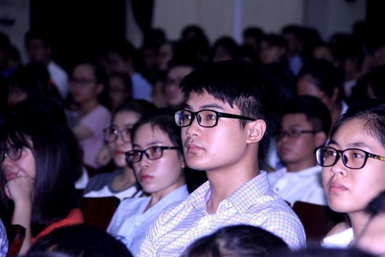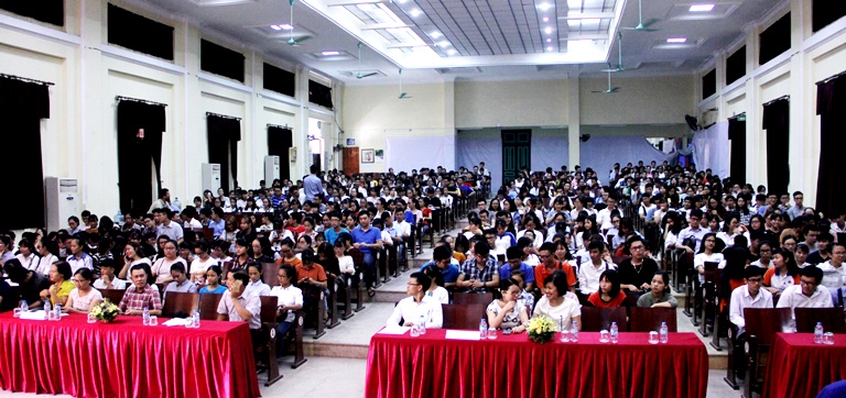 Tân sinh viên Khoa Sinh học - ĐHKHTN và Khoa Y Dược - ĐHQGHN ngồi kín Hội trường Mễ Trì - 182 Lương Thế Vinh trong ngày gặp mặt