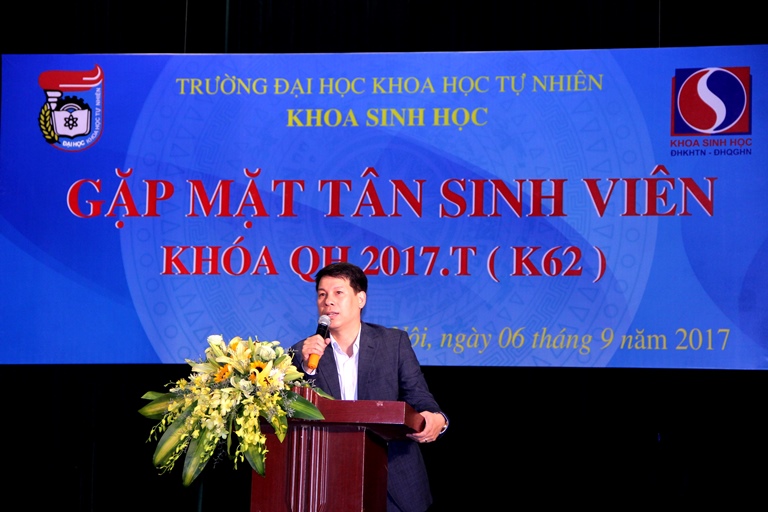 PGS. TS. Nguyễn Quang Huy - Trưởng Khoa Sinh học chia sẻ niềm tự hào về Trường, về Khoa cũng như phương pháp học tập với hơn 400 tân sinh viên Khoa Sinh học - ĐHKHTN và hơn 200 tân sinh viên Khoa Y Dược - ĐHQGHN. PGS. TS. Nguyễn Quang Huy nhấn mạnh: "Ở đâu cũng có việc làm. Công việc luôn chờ các em, quan trọng là các em có sẵn sàng không".
